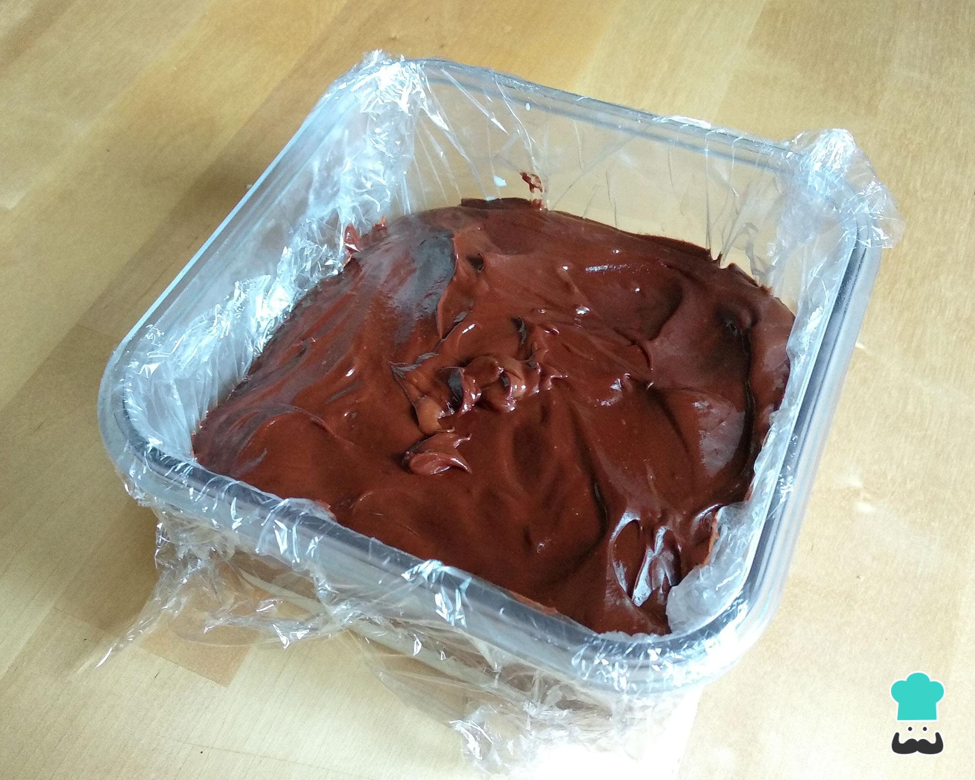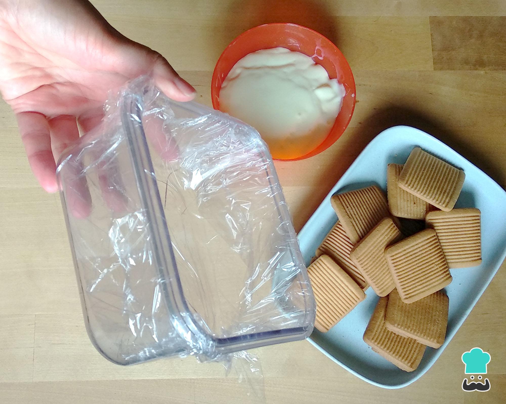 Enquanto isso forre com plástico filme uma assadeira pequena (aproximadamente 15x15 cm ou 10x20 cm) - isso ajudará a desenformar esta sobremesa rápida mais facilmente quando estiver pronta.