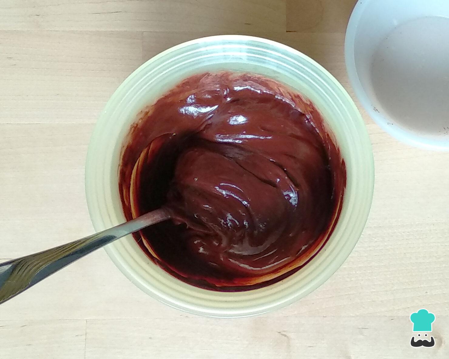 Enquanto isso, esquente o creme de leite no microondas em potência máxima por 1-2 minutos (não precisa ferver, apenas esquentar). Adicione o chocolate picadinho e misture até derreter o chocolate completamente.