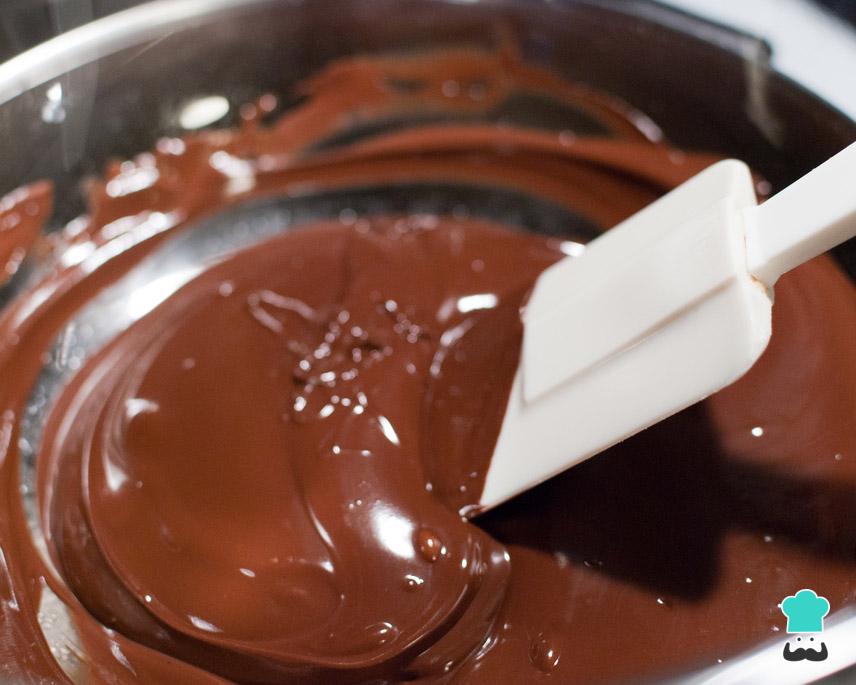 Derreta o chocolate em banho-maria ou no microondas em potência máxima, em ciclos de 30 segundos, retirando para mexer - é importante derreter o chocolate desse jeito para ele não queimar. Deixe esfriar um pouco, coloque o creme de leite e mexa até misturar bem.