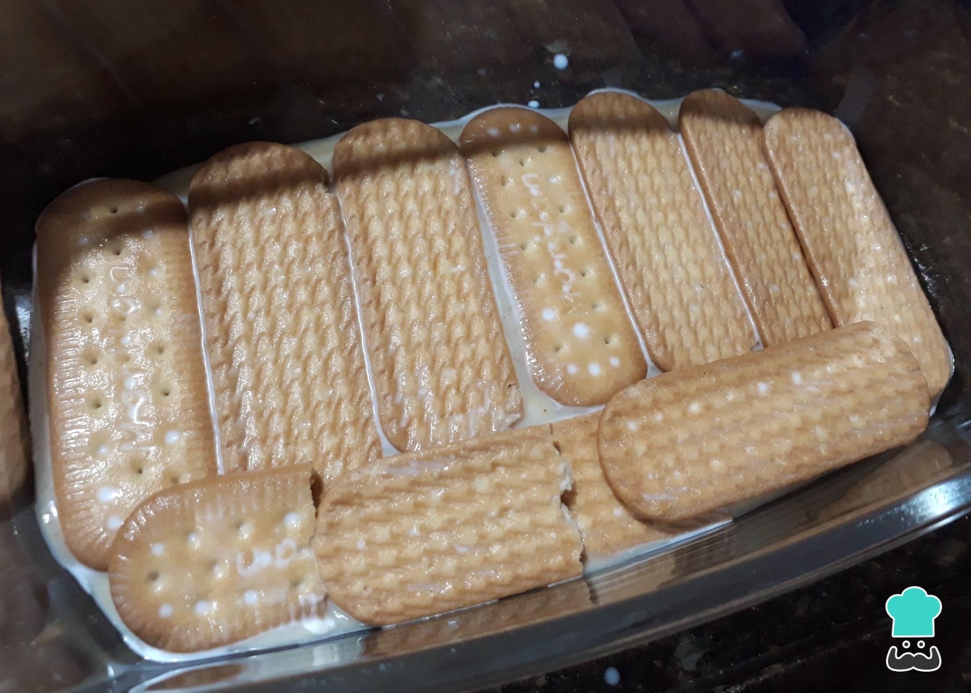 Após os passos anteriores monte este doce de biscoito gelado num refratário: coloque uma camada do creme branco, cubra com biscoito, coloque outra camada de creme branco e cubra com mais biscoito. Faça desse jeito até terminar e complete com o chocolate do passo anterior.