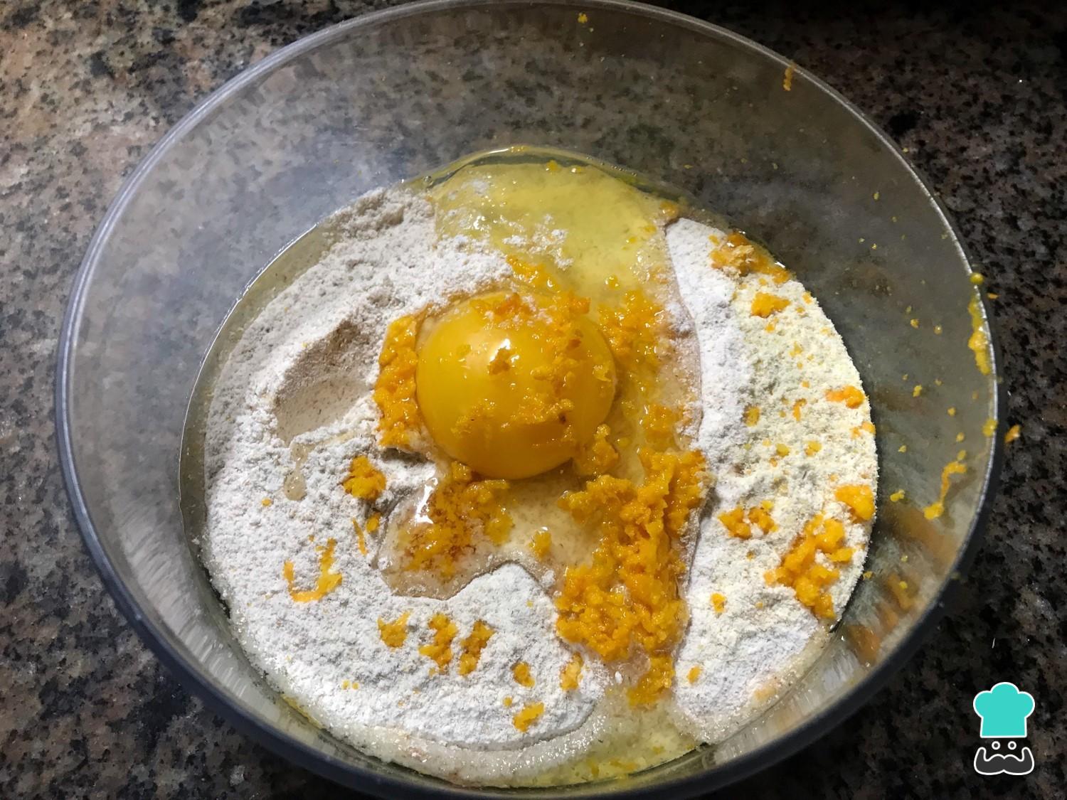 Para começar esta receita de biscoito integral saudável misture todos os ingredientes numa tigela, exceto as amêndoas. Se você quiser, poderá substituir 10% da quantidade de farinha por cacau amargo - ou seja, em vez de usar 110 gramas de farinha, poderá usar 100 gramas de farinha e 10 gramas de cacau amargo.