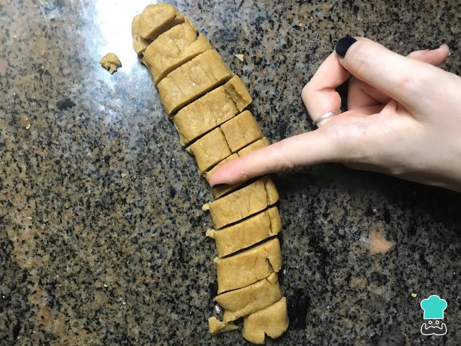 Misture todos os ingredientes com as mãos ou na batedeira até formar uma massa densa e lisa. Depois modele a massa em forma de um rolinho e corte em rodelas com cerca de 1 dedo de espessura, como na foto.