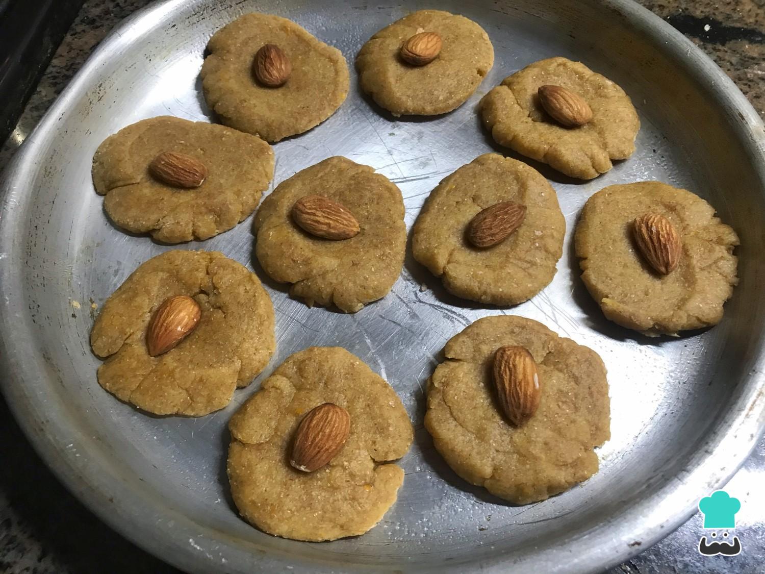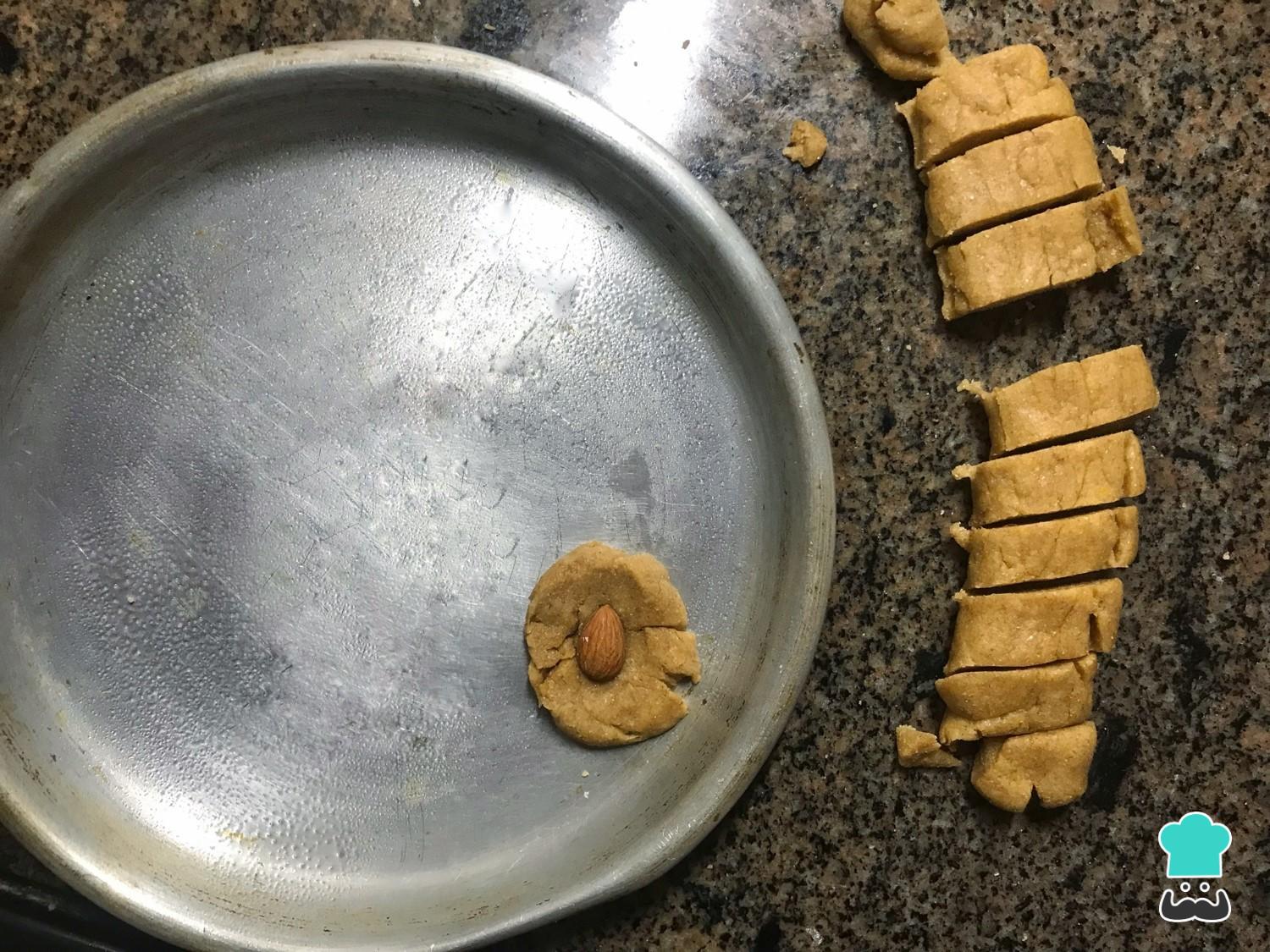 Unte uma assadeira ou bandeja de forno com um pouco de óleo, coloque uma rodela de massa, espalme com a palma da sua mão para que fique mais compacta e afunde uma amêndoa, exercendo alguma pressão para que ela grude na massa.