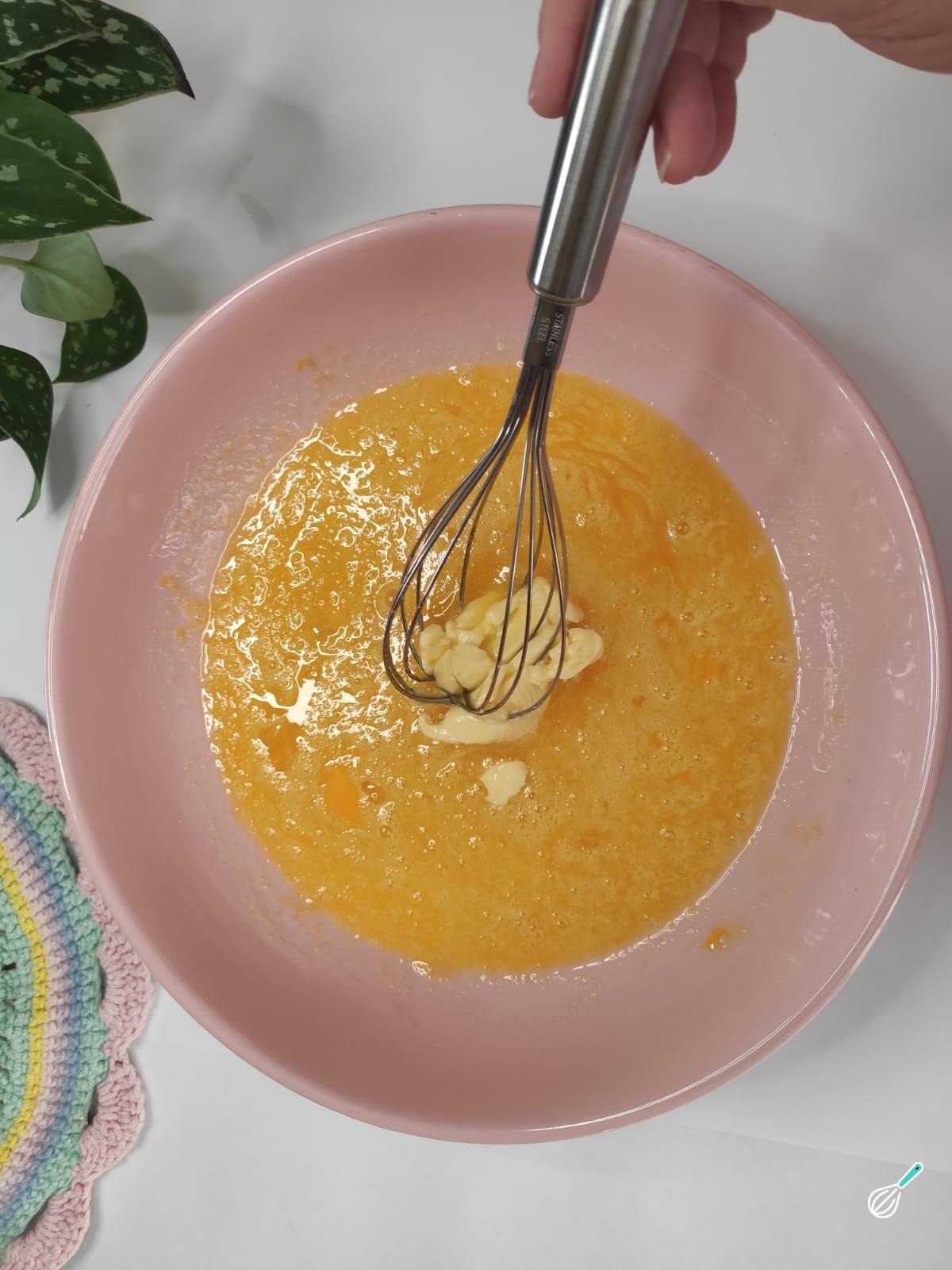 Em uma tigela misture bem os ovos e a manteiga, até ficar um creme bem clarinho.