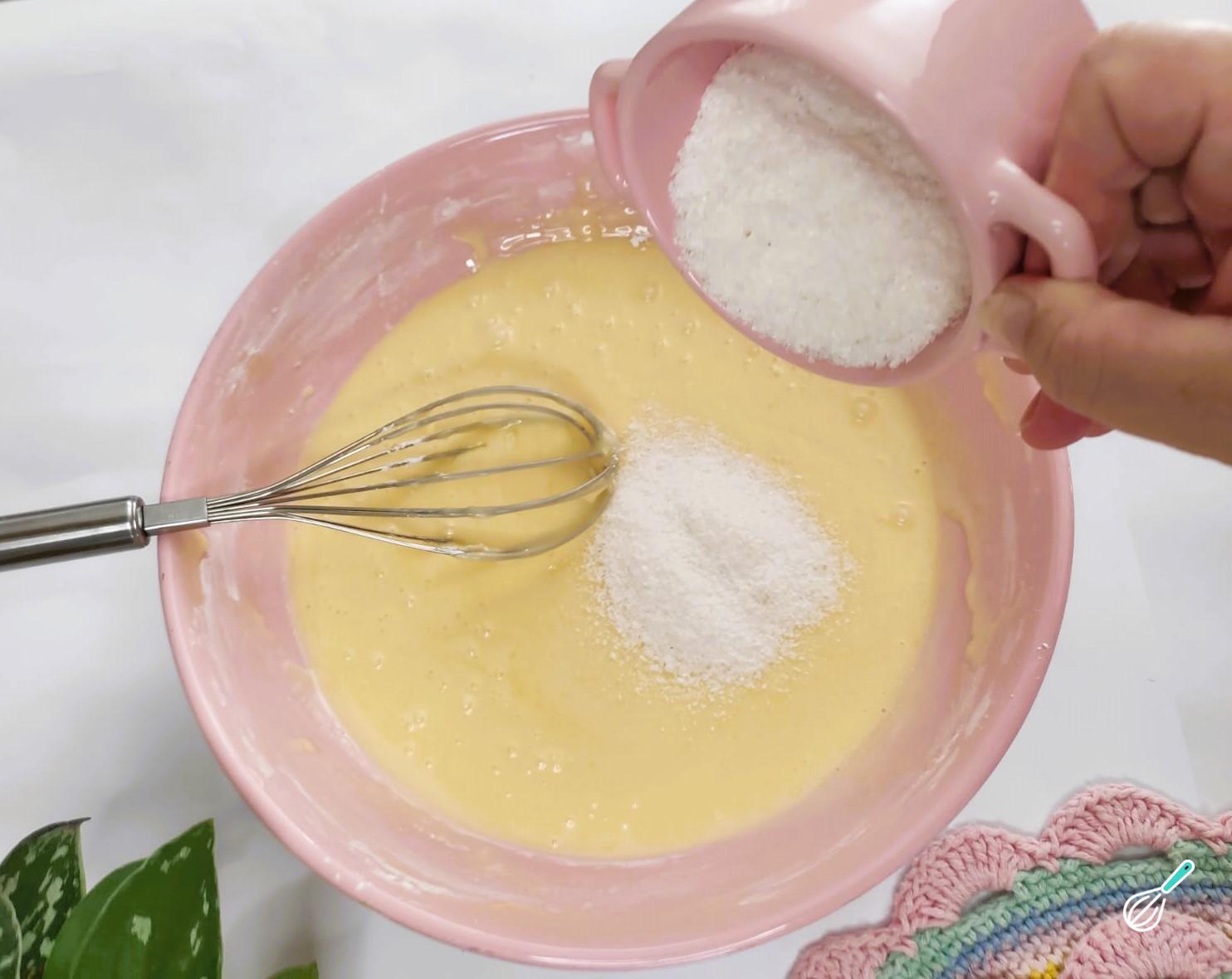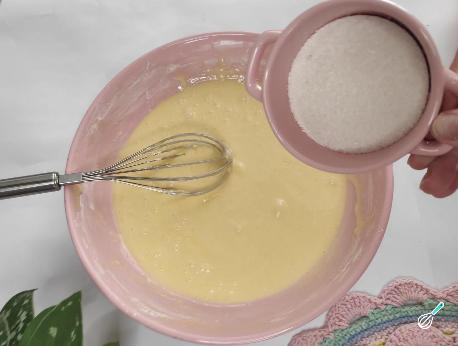 Adicione também o açúcar, mexendo delicadamente.