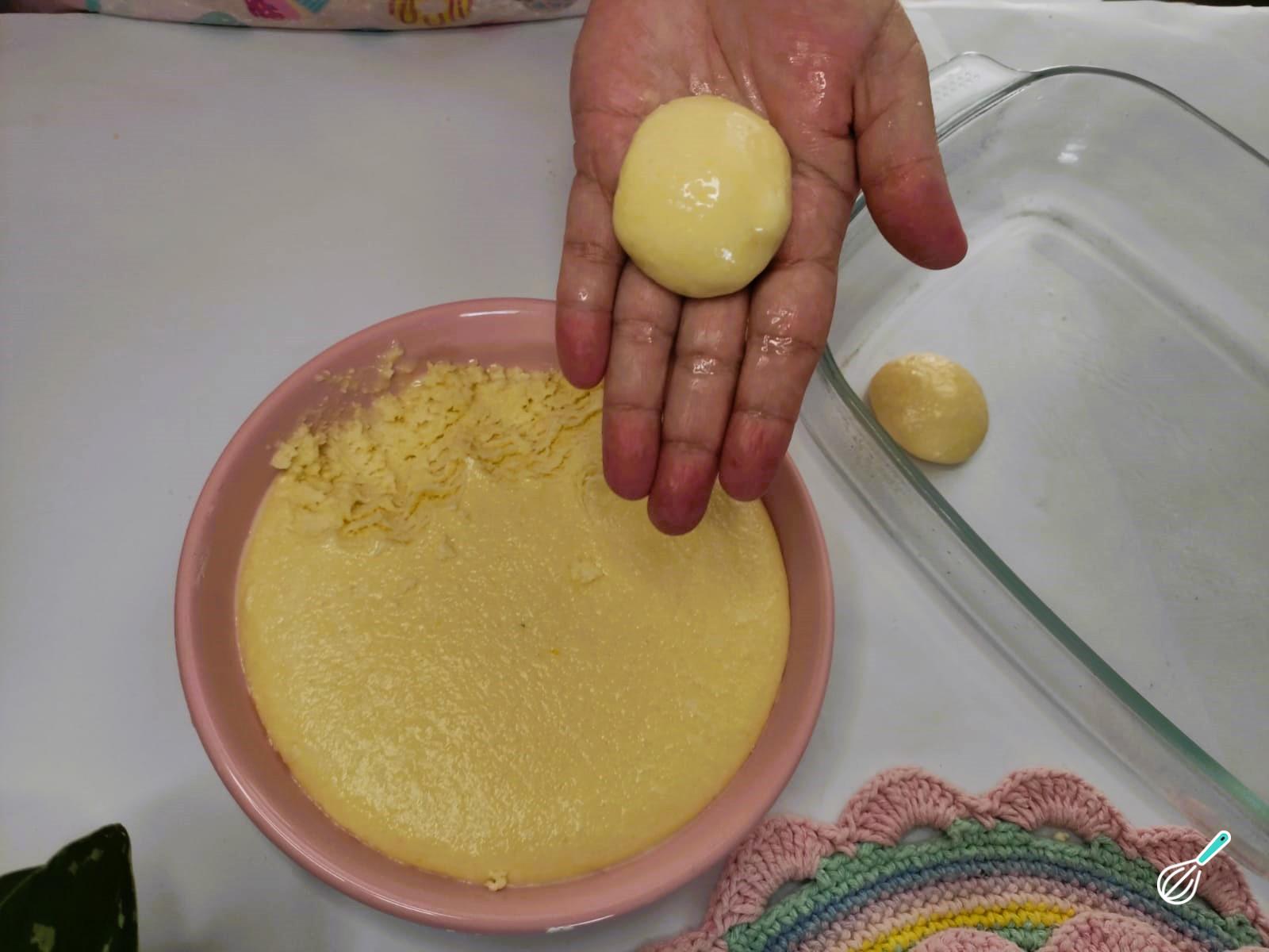 Com as mãos untadas, pegar uma porção pequena da massa, fazendo bolinhas do tamanho que preferir.