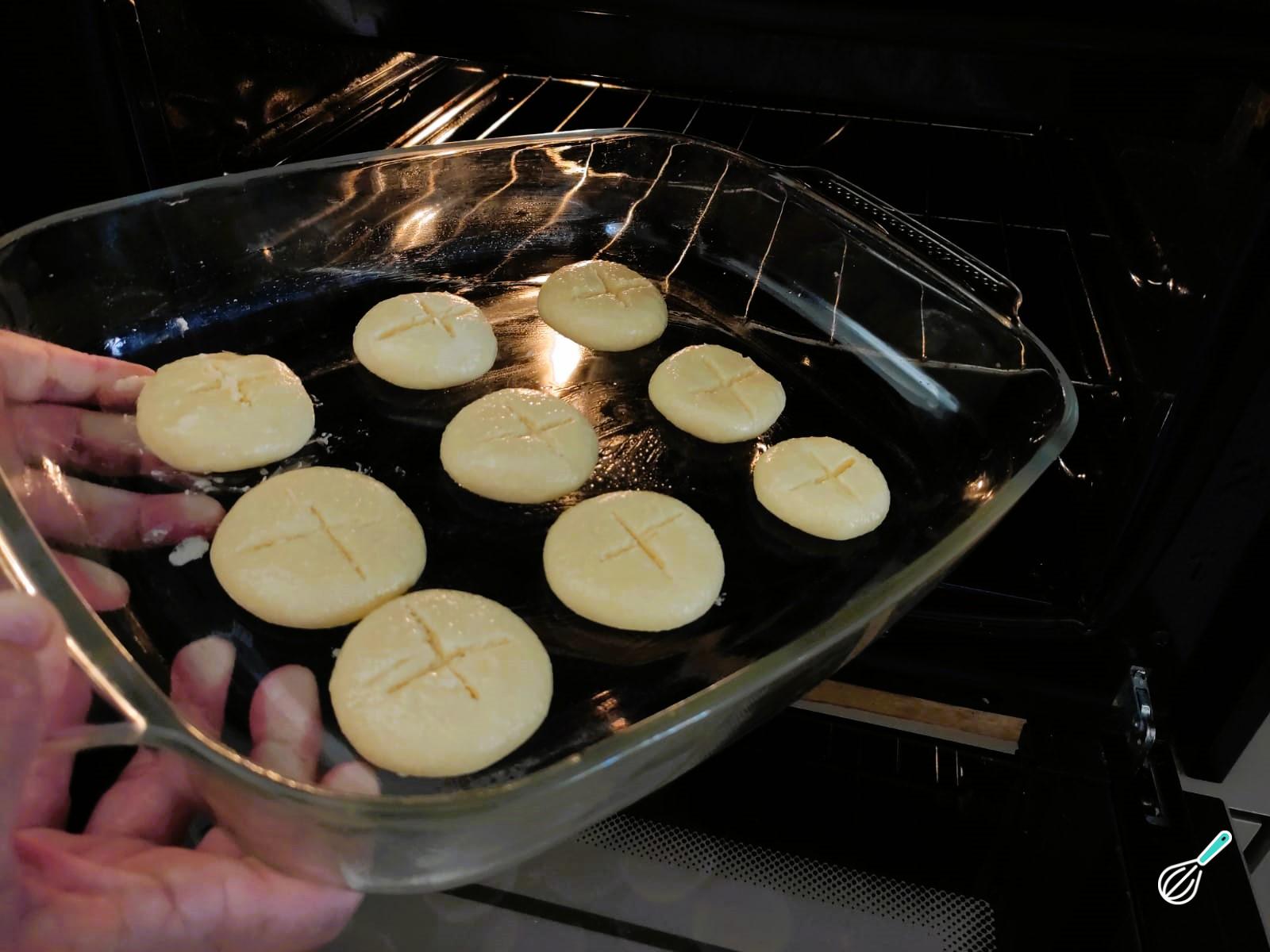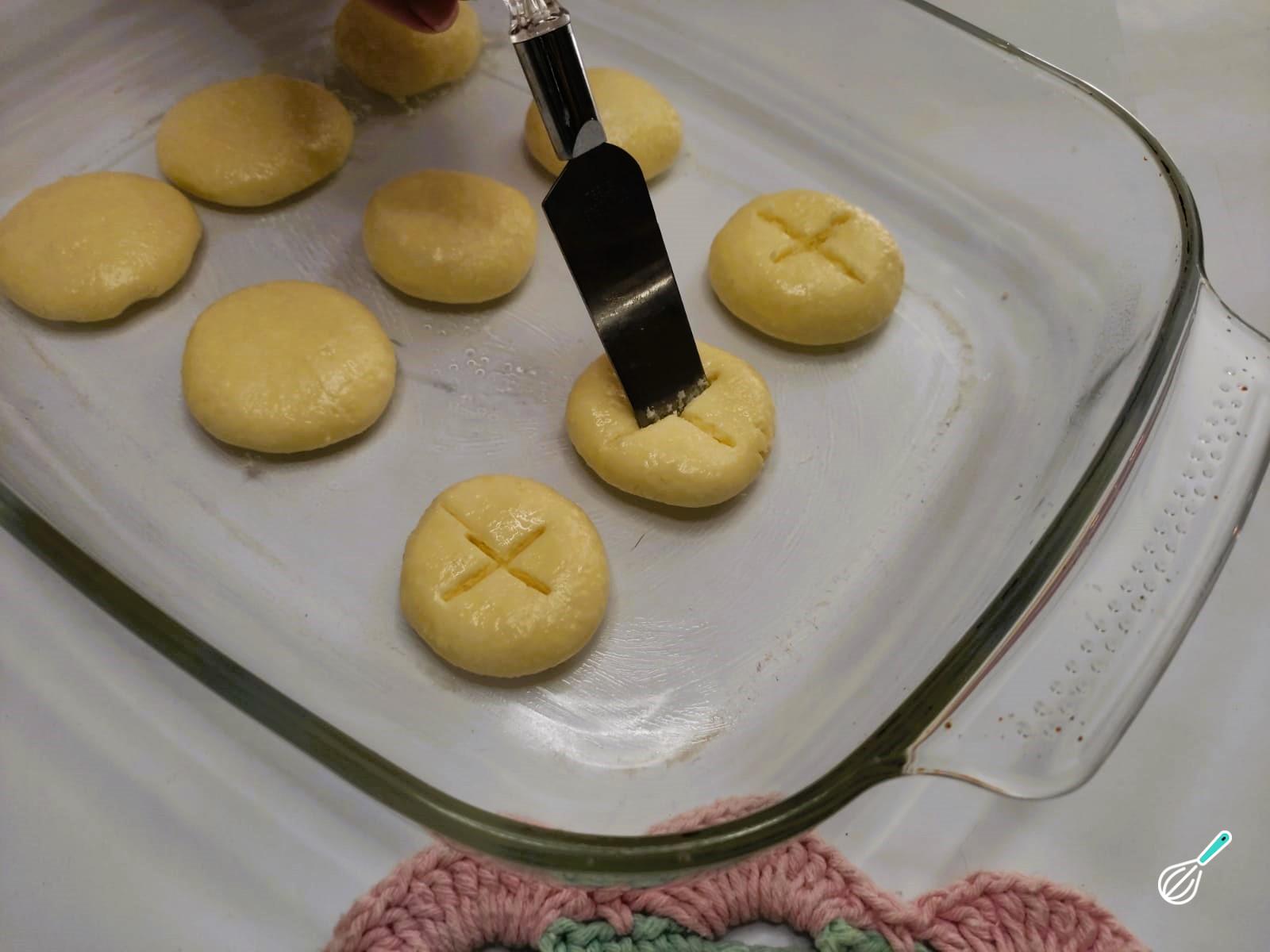 Em seguida, coloque as bolinhas em uma assadeira levemente untada com óleo, pressionando com uma espátula ou uma faca sem ponta, em formato de cruz, para fazer o acabamento.