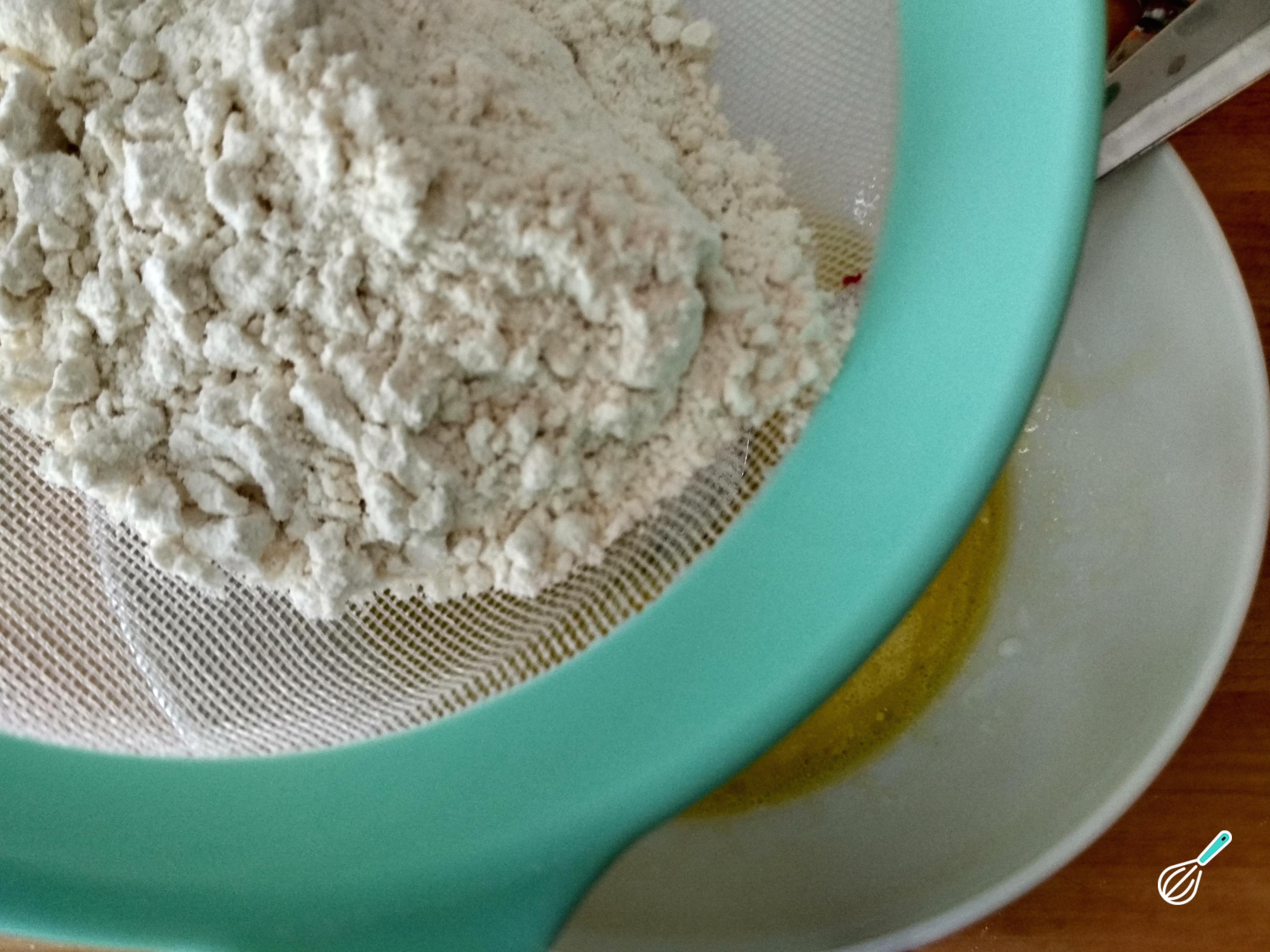Peneire a farinha junto com o fermento e o sal e adicione aos ingredientes anteriores. Misture muito bem e, quando começar a ficar pesada, continue misturando com as mãos.