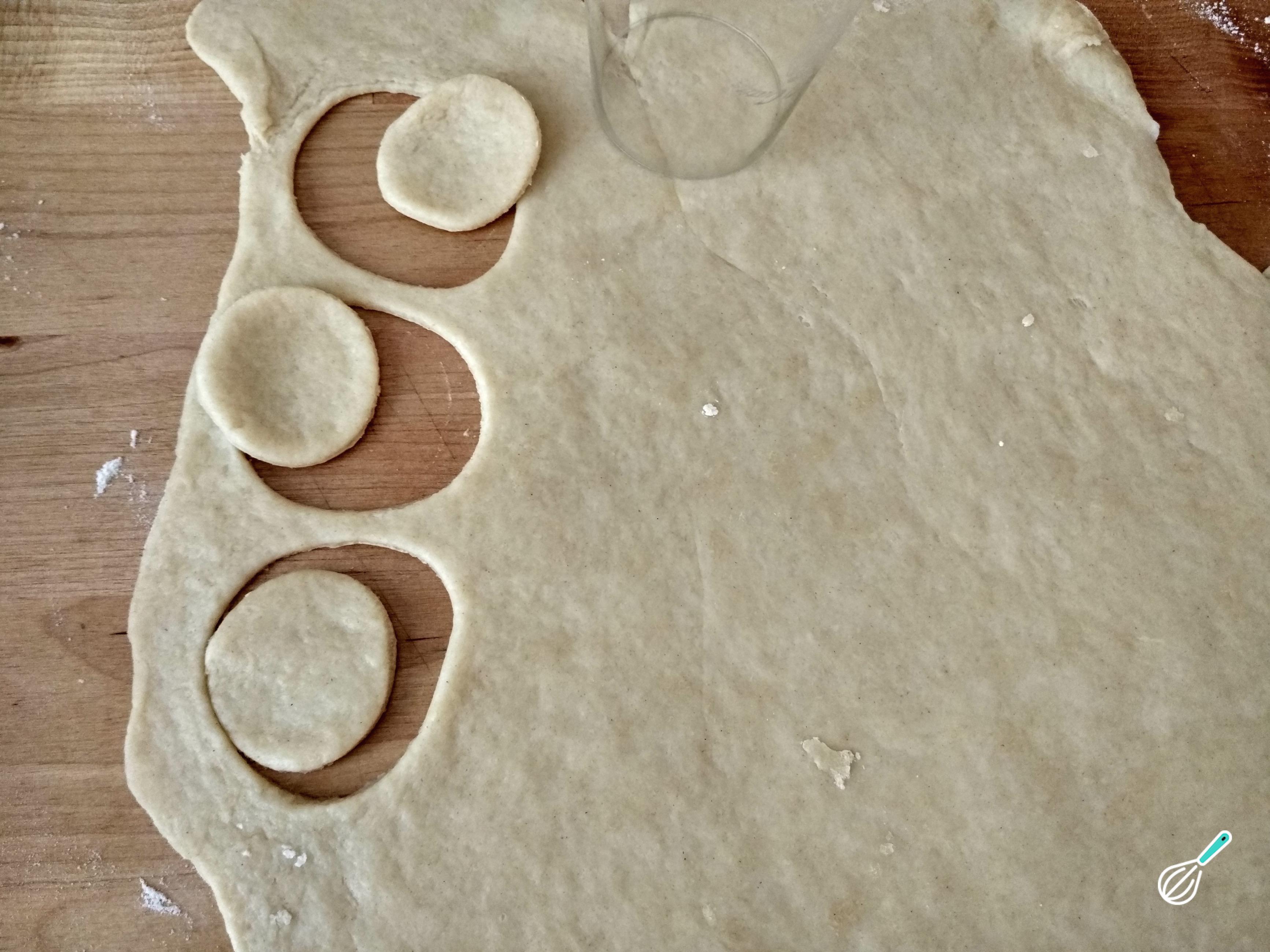 A massa deverá ficar com menos de 5mm de espessura. Depois use um copo um cortador pequeno para cortar os biscoitinhos de azeite.