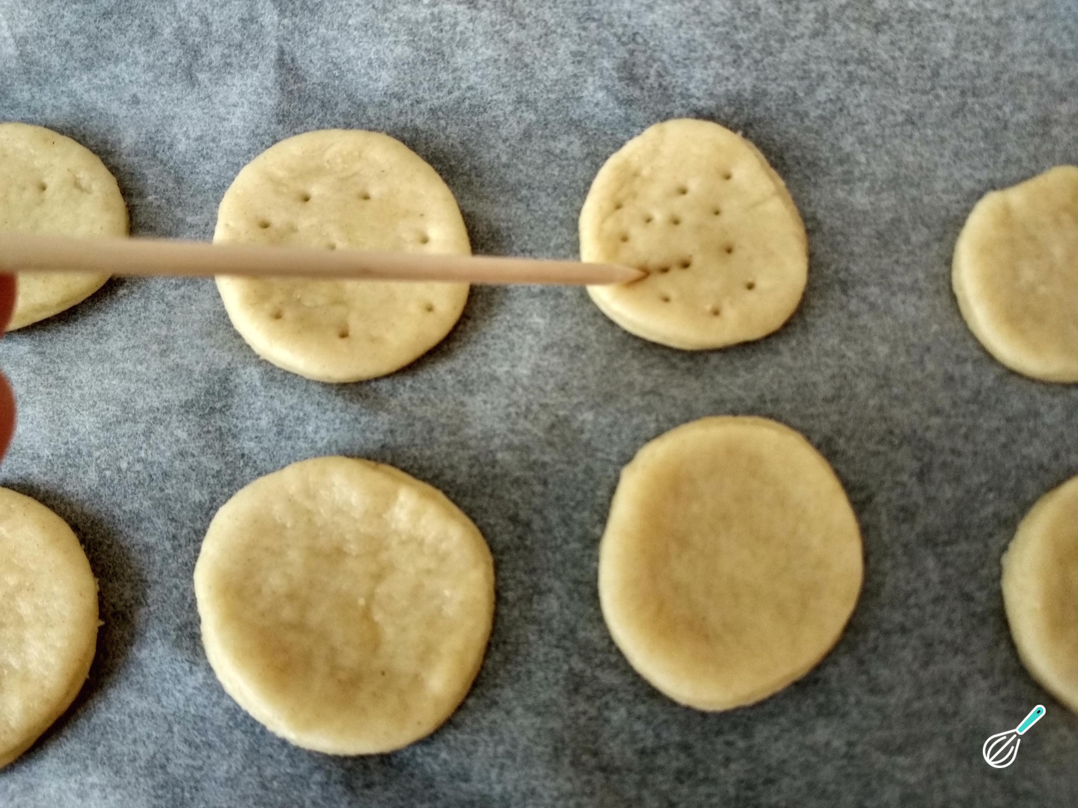 Coloque as rodelas de biscoito em um tabuleiro de forno com papel manteiga e pique cada um deles com um palito ou garfo, para evitar que fiquem com bolas de ar enquanto assam. Leve a forno preaquecido a 180ºC durante 15-18 minutos, ou até dourar.