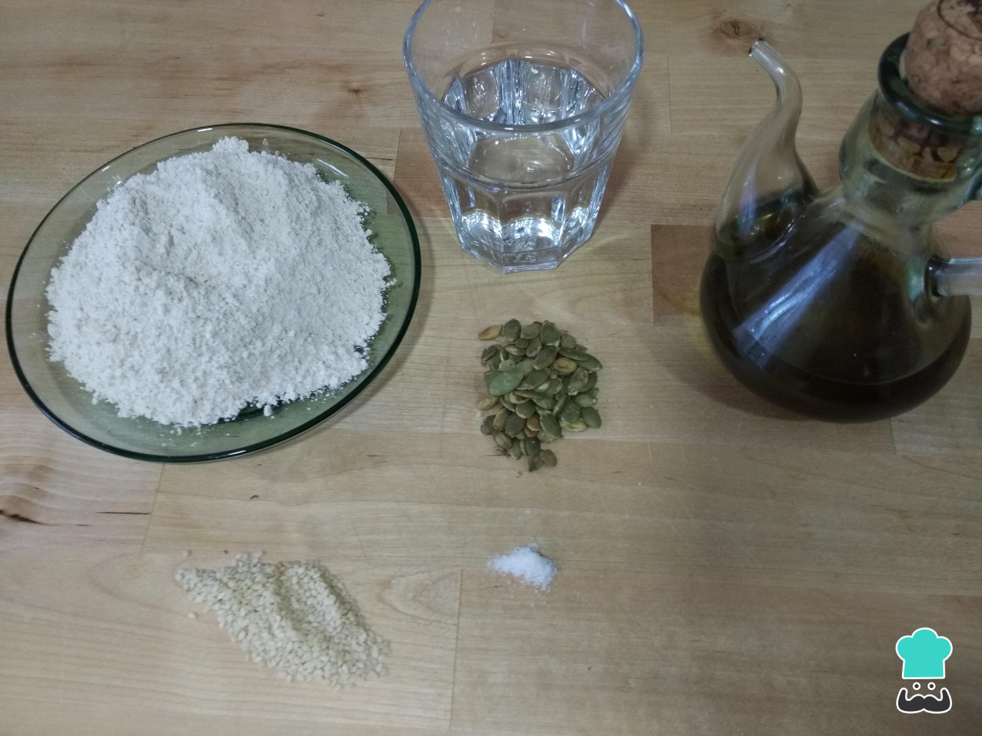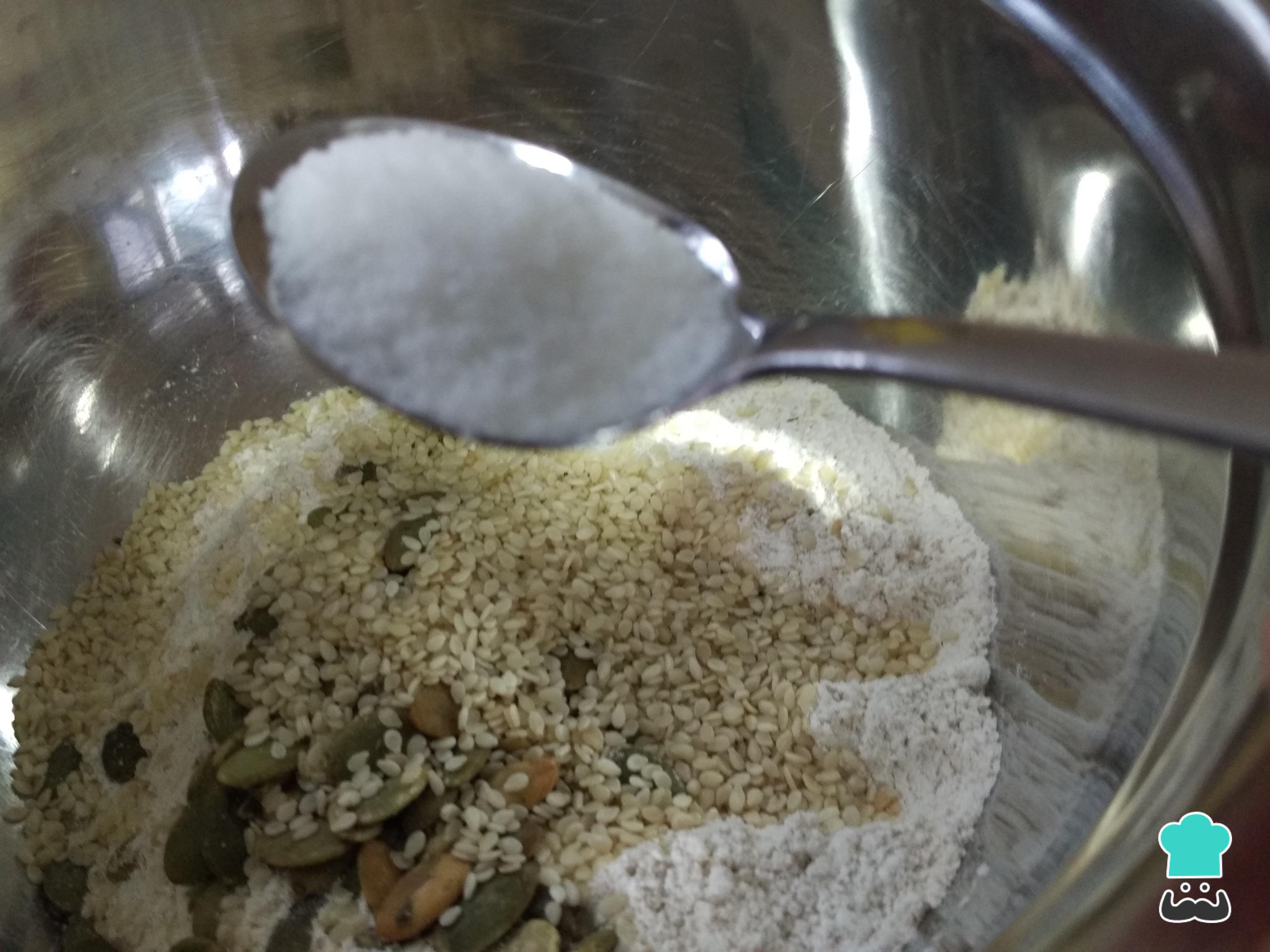 Em uma tigela misture a farinha com as sementes de abóbora, o gergelim e o sal.