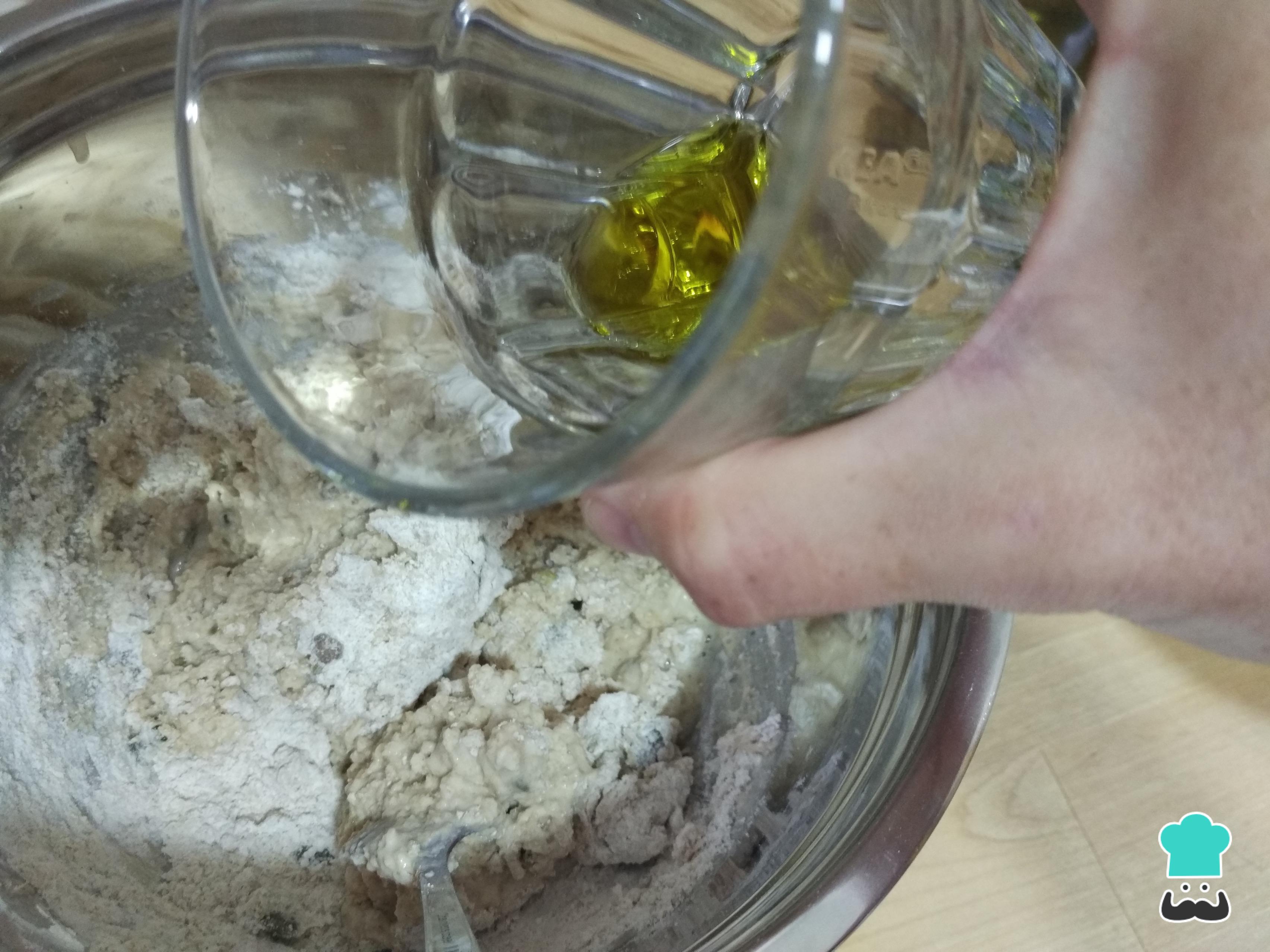 Para ligar todos estes ingredientes, acrescente a água e o azeite de oliva e misture com uma colher, até virar uma pasta pegajosa.