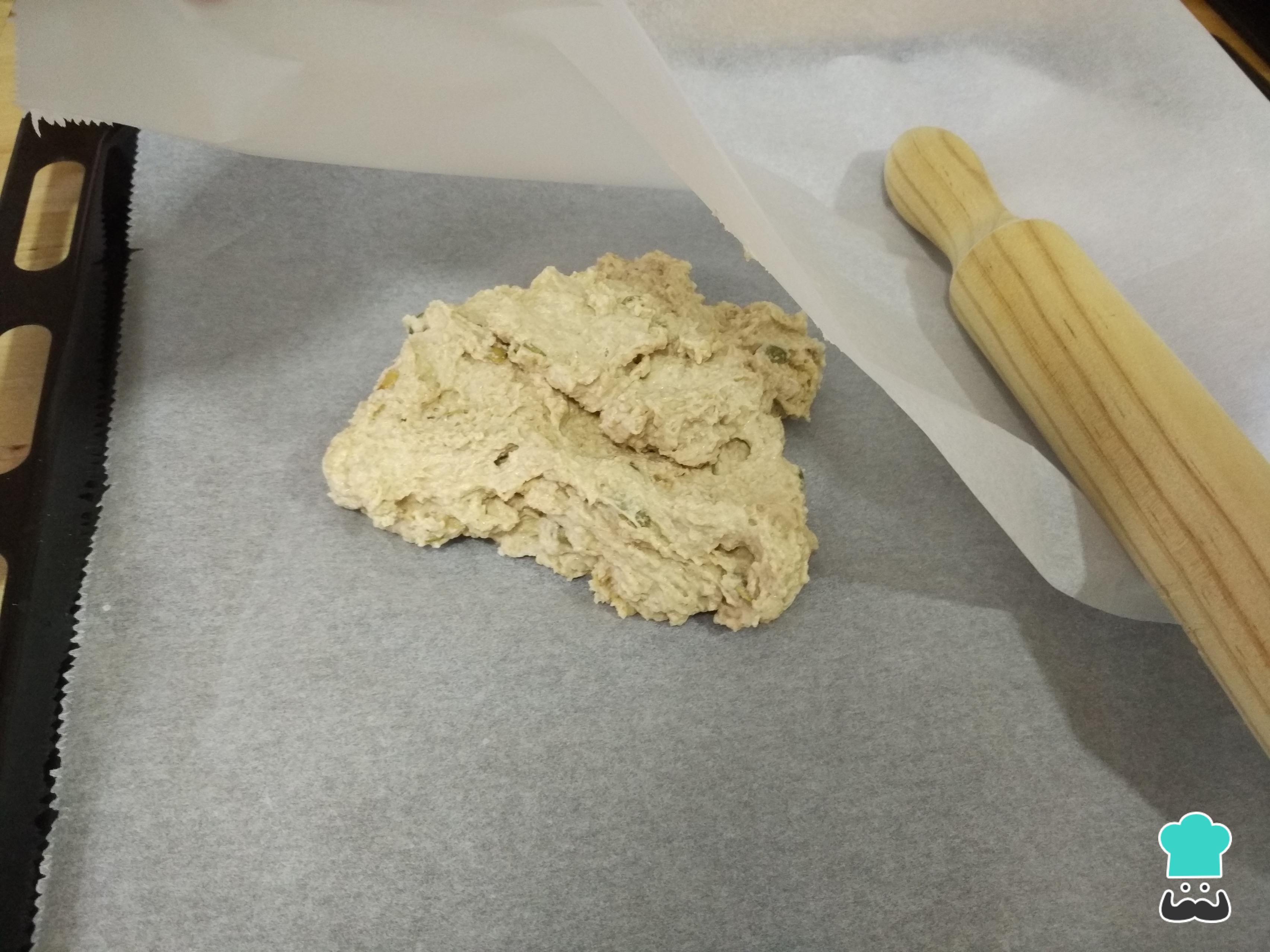 Forre um tabuleiro de forno com papel manteiga, coloque aí a massa do biscoito salgado vegano, cubra com outra folha de papel manteiga e abra, usando um rolo. A massa deve ficar fina, mas não demasiado.
