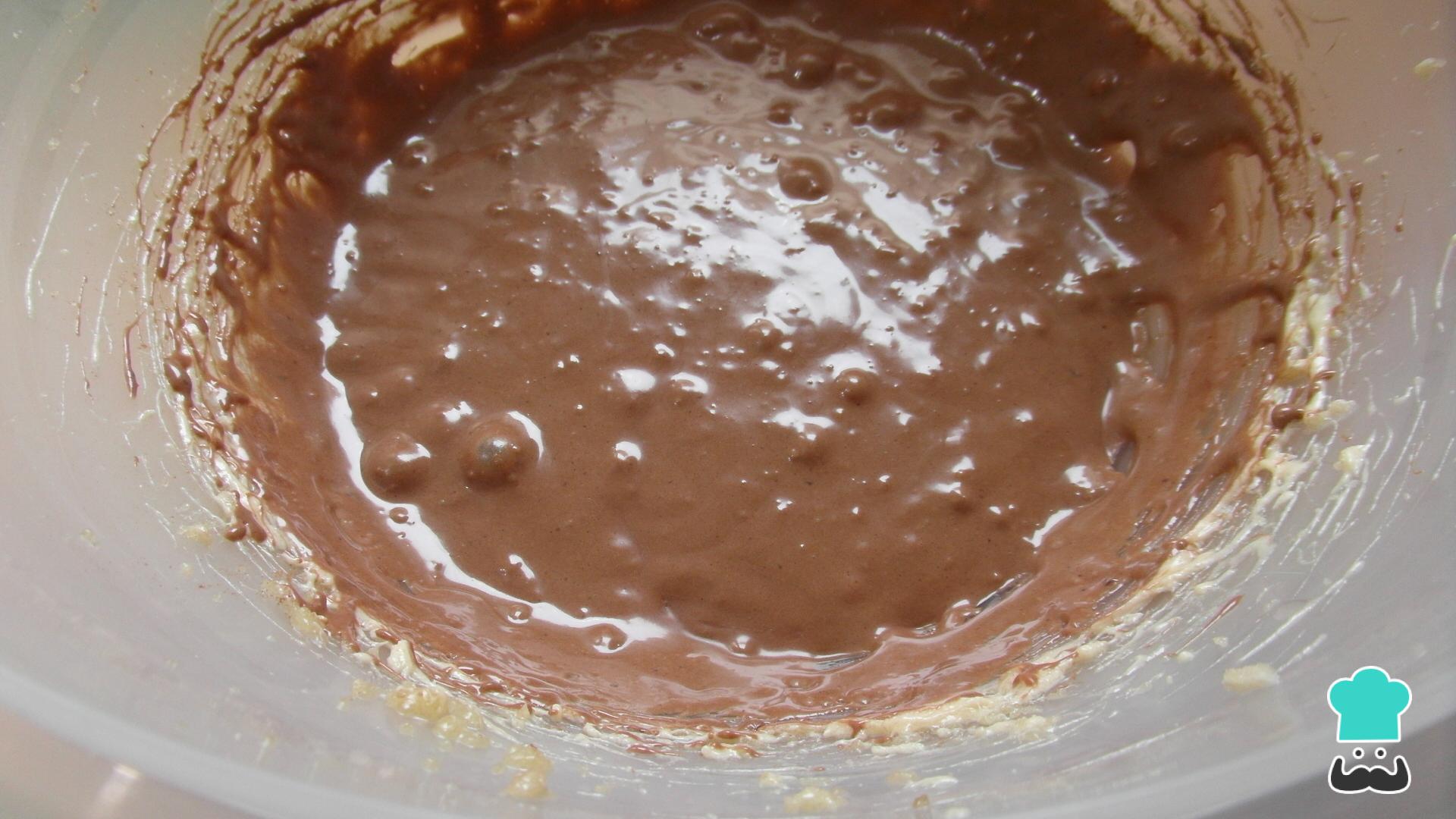 Acrescente o ovo e misture muito bem. Depois adicione o chocolate derretido e não quente (caso contrário irá cozinhar os ovos) e bata para obter uma mistura homogênea como na imagem.