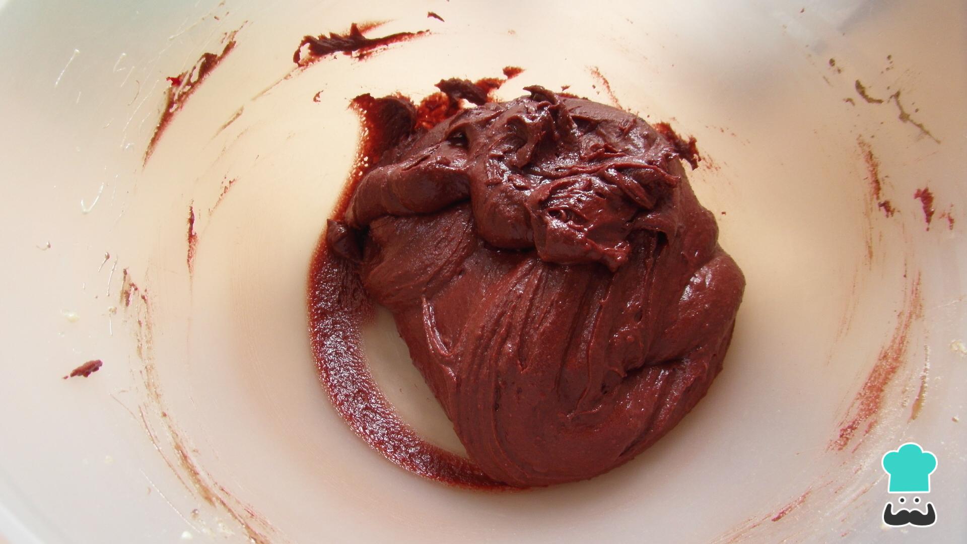 Finalmente adicione a farinha, o cacau, o fermento, o sal e o corante alimentício e misture delicadamente a massa destes biscoitos de Natal com uma espátula, somente até incorporar tudo.