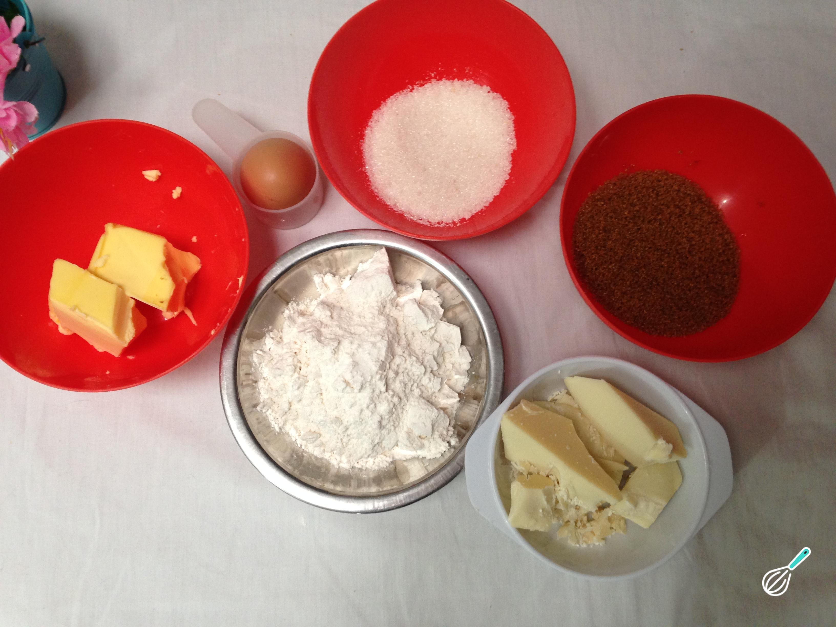 Para fazer esta receita de biscoitos de chocolate branco comece por reunir os ingredientes.