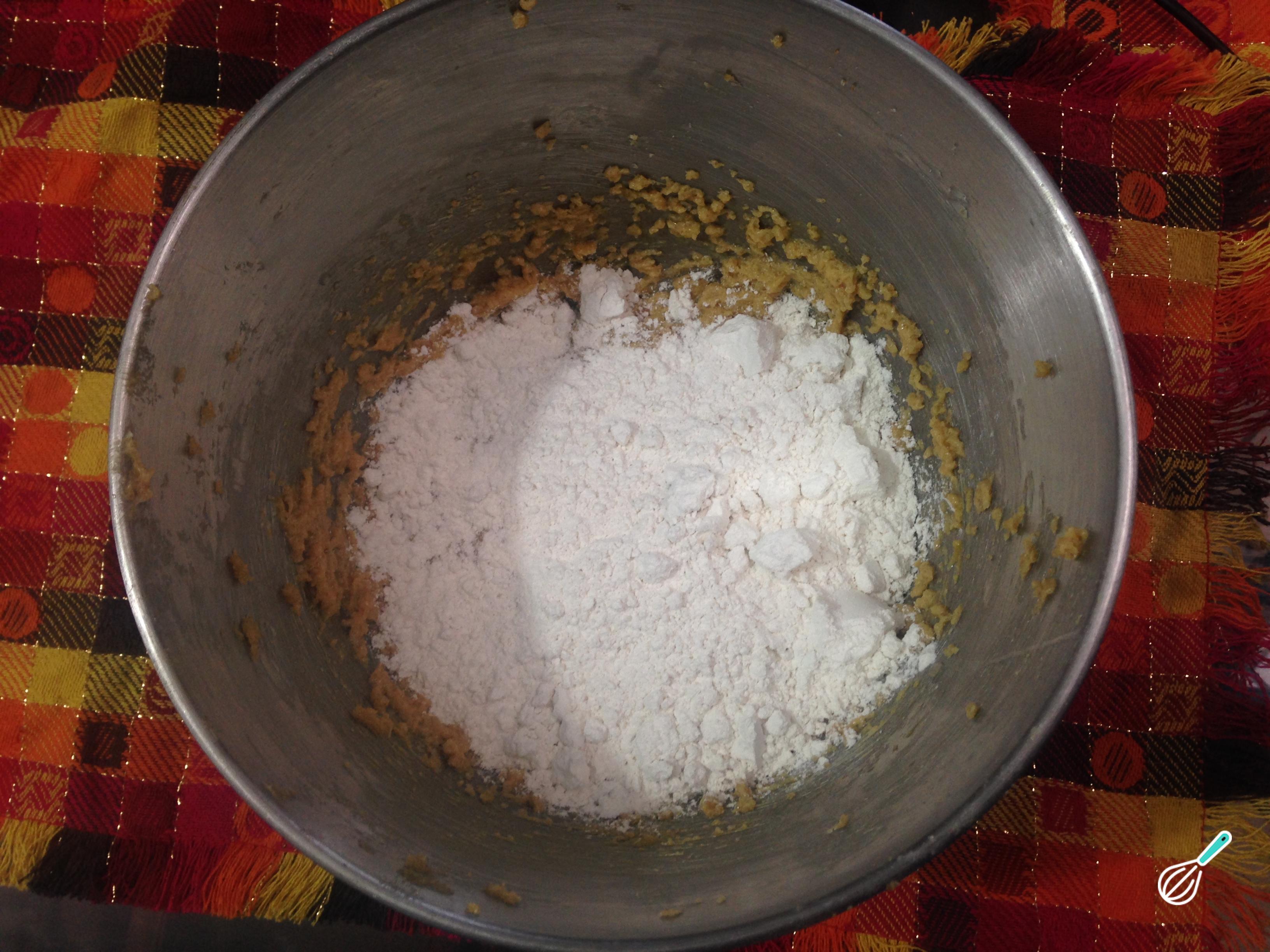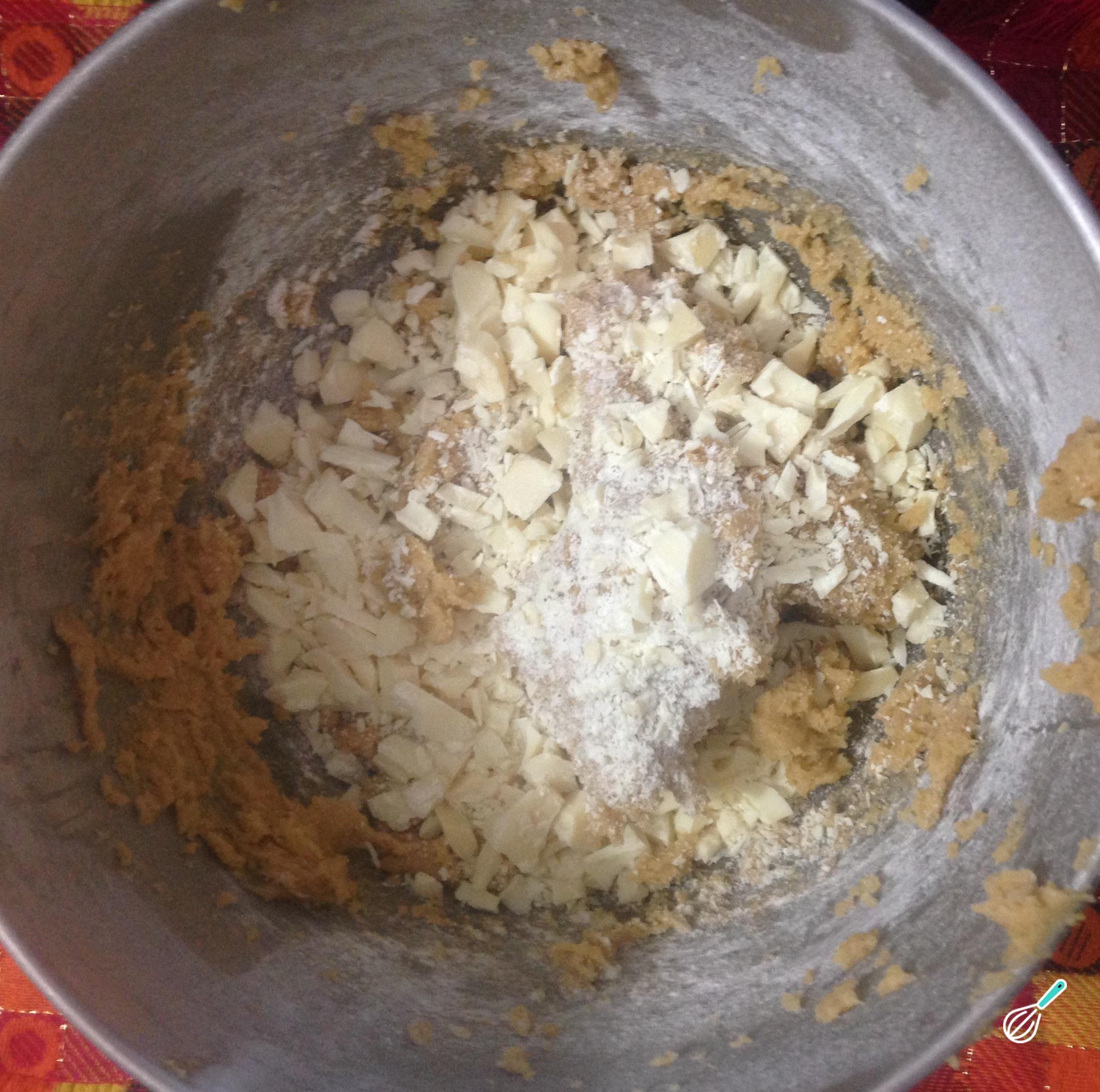 Adicione a farinha e misture novamente a massa dos biscoitos de chocolate branco.
