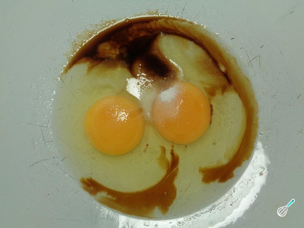 Comece por colocar em uma taça os ovos, a baunilha, e a estévia, bata até que tenha um pouco de espuma na superfície.
