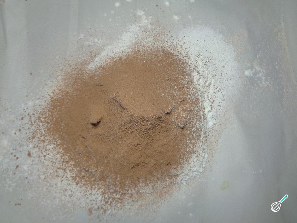 Em uma outra taça, junte a farinha de arroz, o amido de milho, o cacau em pó e misture.