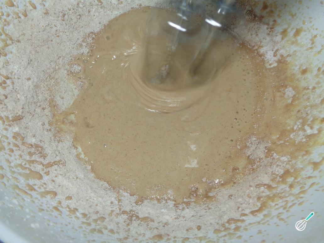 Pegue nas farinhas, junto com o cacau e vá adicionando aos poucos e poucos na taça onde bateu os ovos, batendo em velocidade baixa até obter uma massa homogênea e sem grumos.
