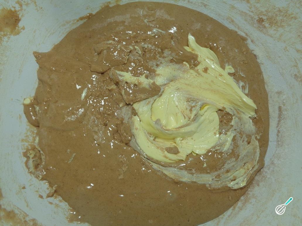 Por último, adicione a manteiga derretida ou muito suave à massa dos biscoitos de chocolate light e continue batendo até incorporar bem.
