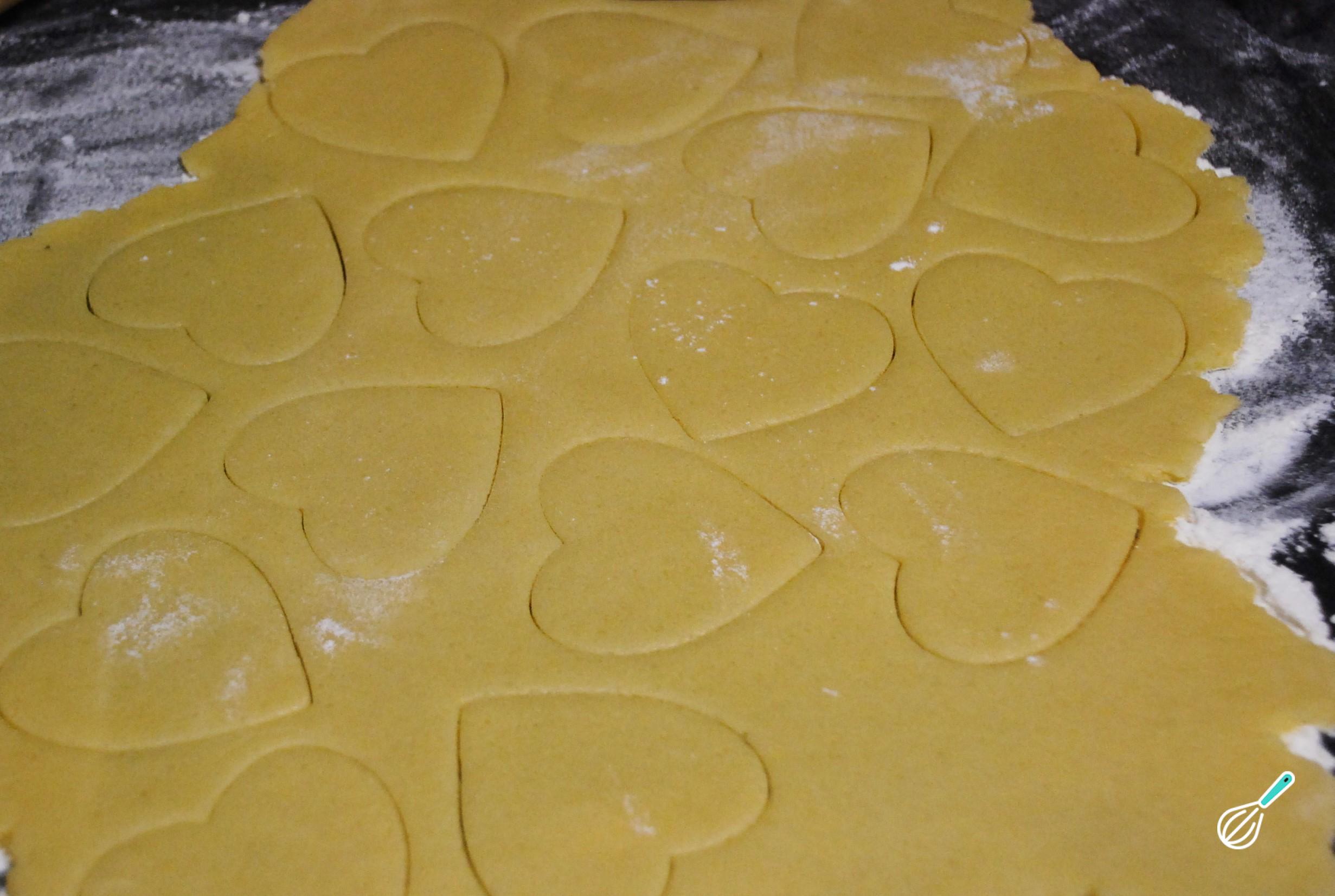 Em seguida estende-se a manteiga dos biscoitos e cortam-se corações com a ajuda de um cortador de biscoitos em forma de coração.