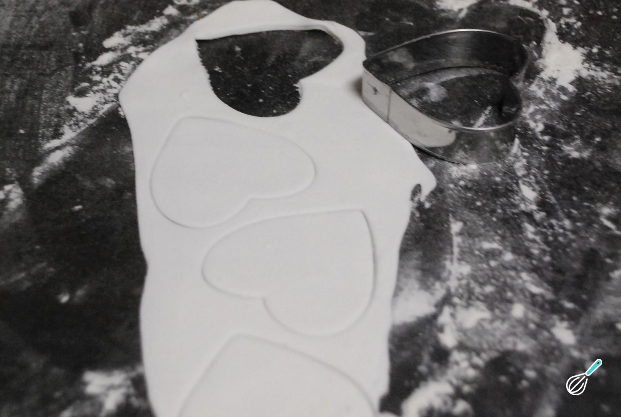 Agora vamos trabalhar o fondant. Você pode usar fondant de loja ou fondant caseiro. Com a ajuda de um rolo de massa, estique o fondant sobre uma superfície polvilhada com açúcar de confeiteiro e corte corações.