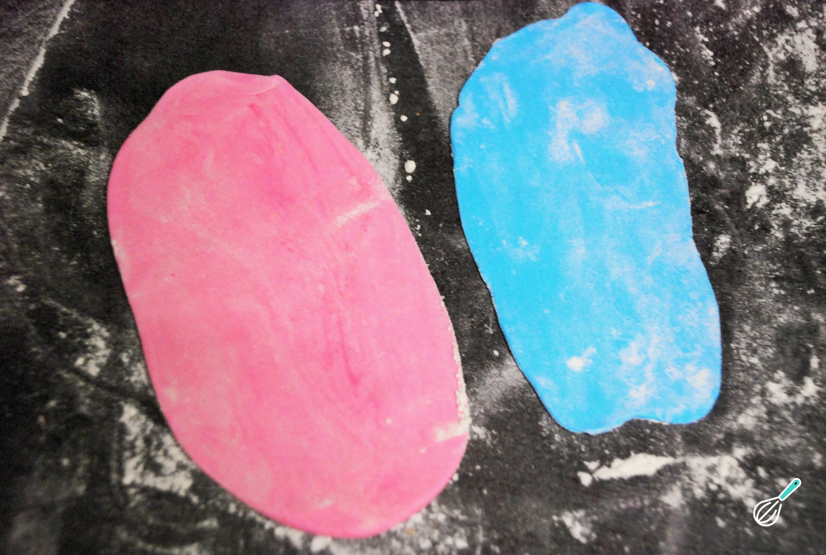 Para colorir o fondant basta separar alguns pedaços, adicionar as gotas de corante e misturar bem. O fondant por tornar-se pegajoso, nesse caso basta adicionar um pouco de farinha ou de açúcar de confeiteiro. Corte corações com a ajuda do cortador menor.
