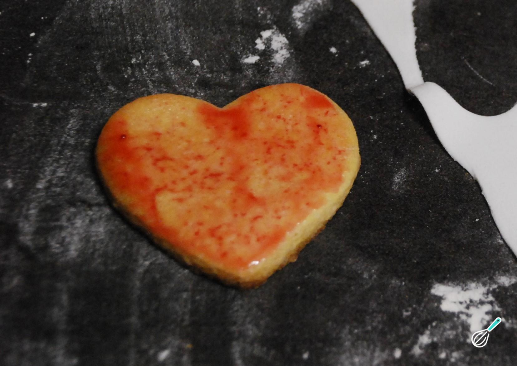 Finalmente espalhe também um pouco de coulis sobre os corações menores e aplique-os centrados nos biscoitos, tal como na fotografia.