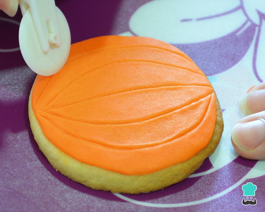 Chega a hora de marcar as linhas nos biscoitos decorados de abóbora para o Halloween: pegue num cortador tipo o das pizzas (como na foto), ou uma faca e, sem pressionar muito, desenhe linhas curvas a partir do topo dos biscoitos, seguindo até ao extremo oposto.