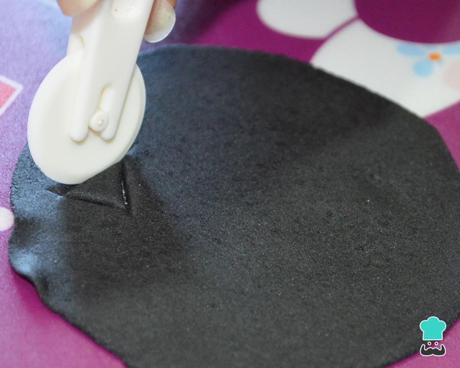 Em seguida abra a pasta americana preta e, com o mesmo utensílio utilizado no passo anterior, corte dois triângulos pequenos, que serão os olhos e a boca das abóboras. Você pode cortar no formato que preferir, nós aconselhamos triângulos para os olhos e um formato em zig-zag ou meia-lua para a boca.