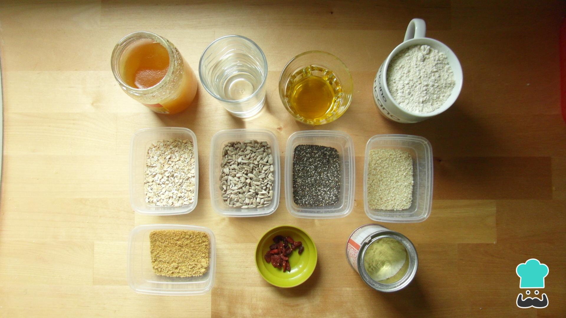 O primeiro passo para preparar estes biscoitos integrais de sementes é reunir os ingredientes.