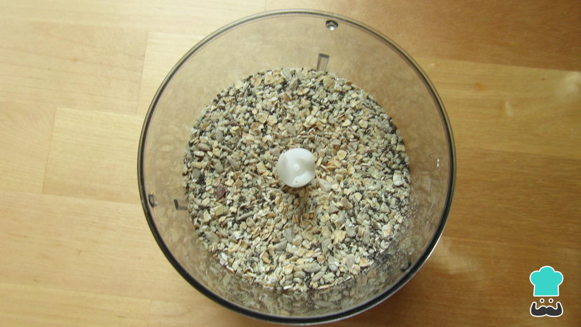Coloque num processador de alimentos todas as sementes e os flocos de aveia, triture ligeiramente.