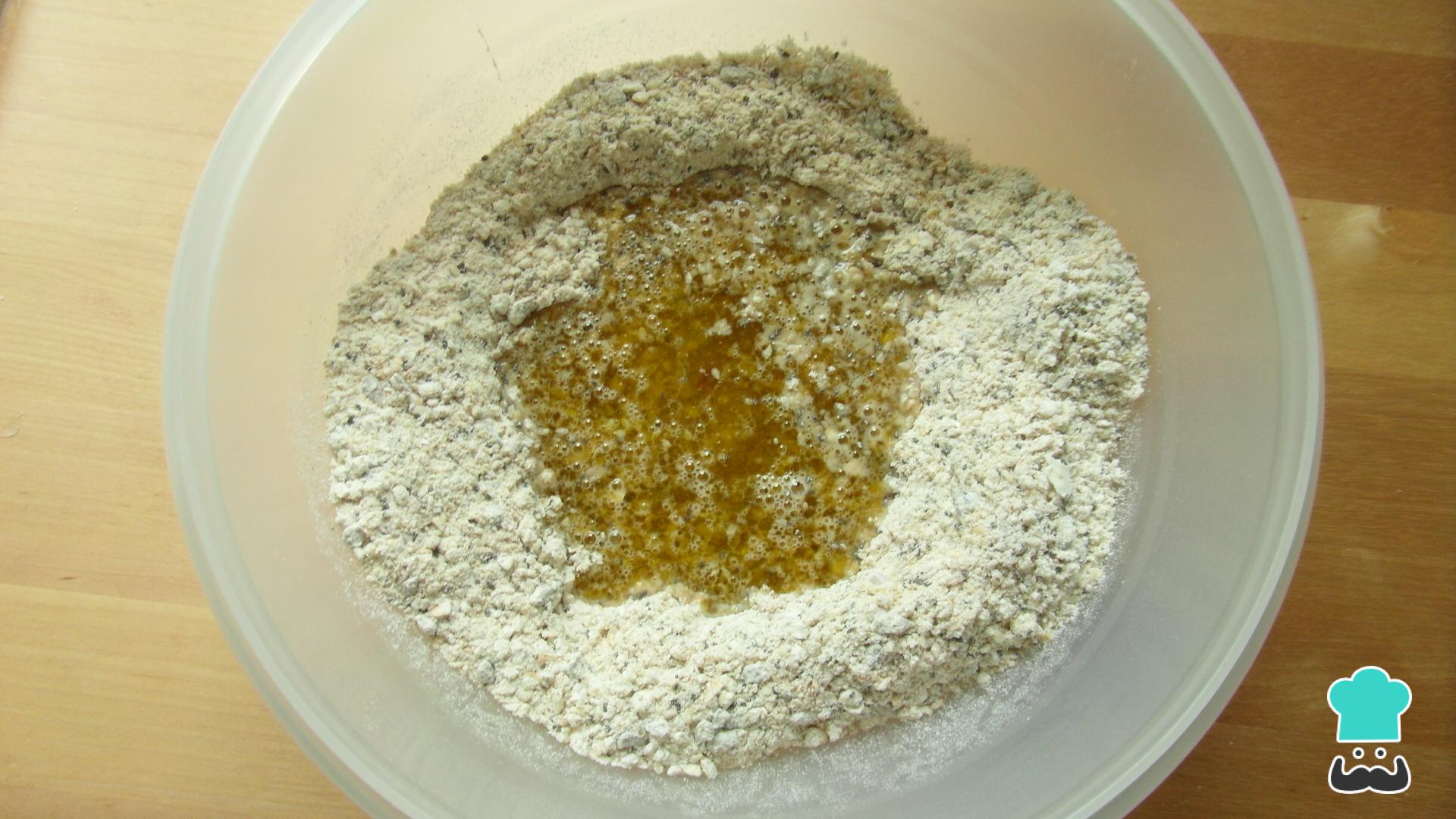 Numa vasilha à parte misture muito bem a água, o azeite e o xarope de bordo ou mel. Abra uma cova no preparado anterior e coloque aí estes líquidos. Misture tudo muito bem com um garfo.