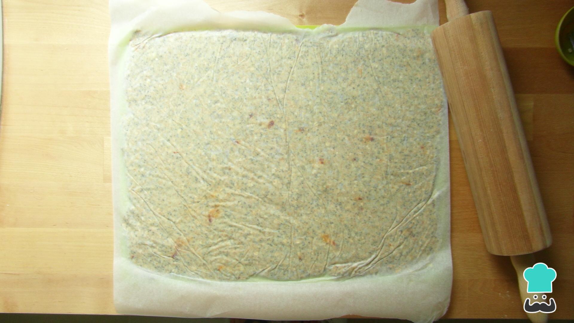 Transfira para um tapete de silicone ou folha de papel manteiga e espalhe ligeiramente com a ajuda do garfo. Coloque sobre a massa uma folha de papel manteiga e, com um rolo, estenda muito bem (quanto mais fina for a massa, mais crocantes ficarão estes biscoitos).