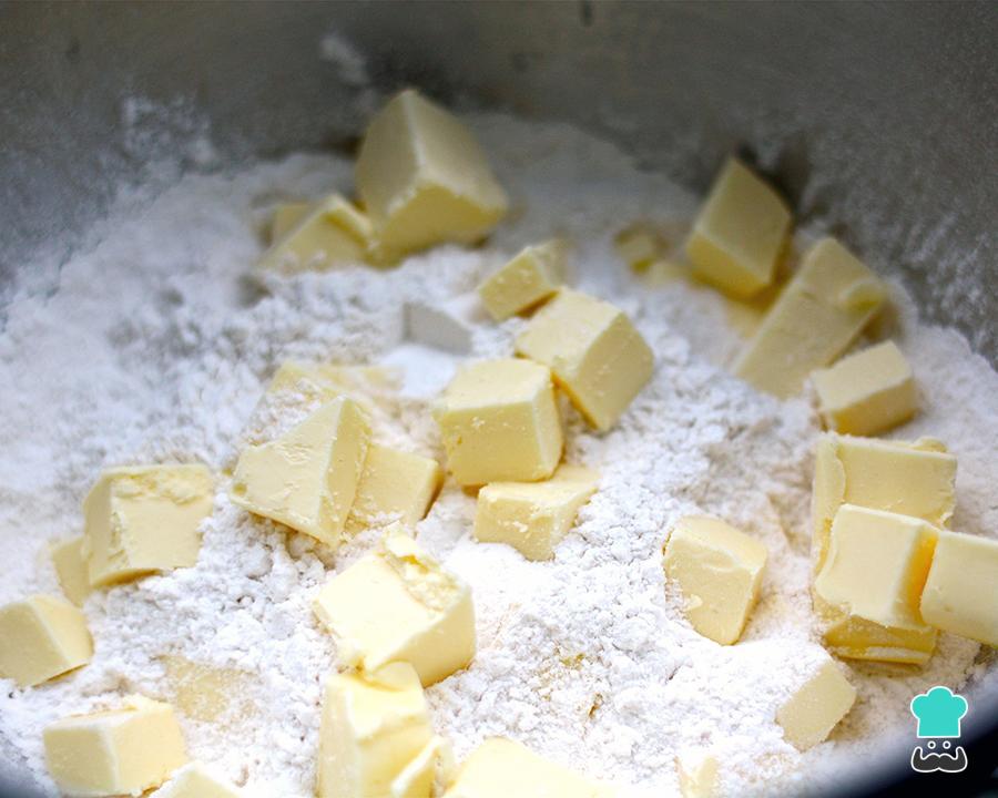 Para começar a fazer estes simples biscoitos simples, comece por preaquecer o forno a 190ºC. Depois misture em uma tigela a farinha e a manteiga com as mãos, até obter uma consistência de farofa.