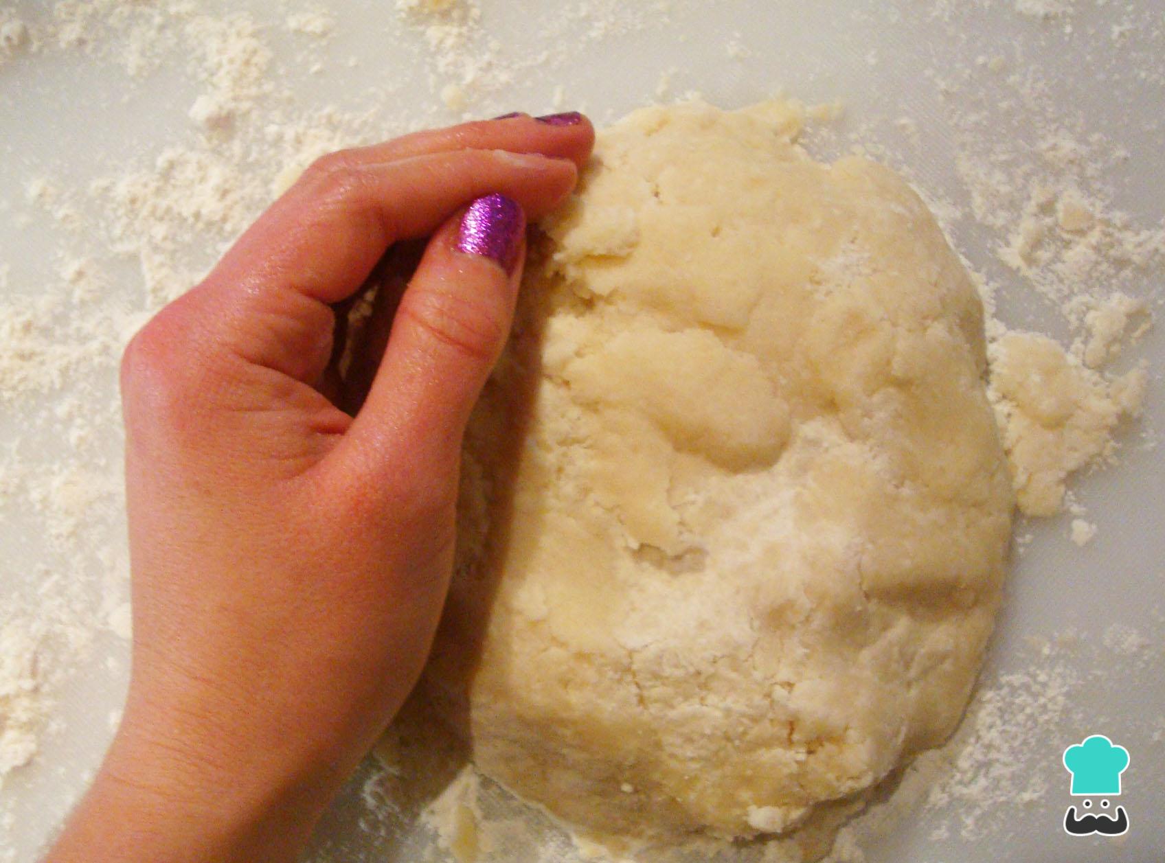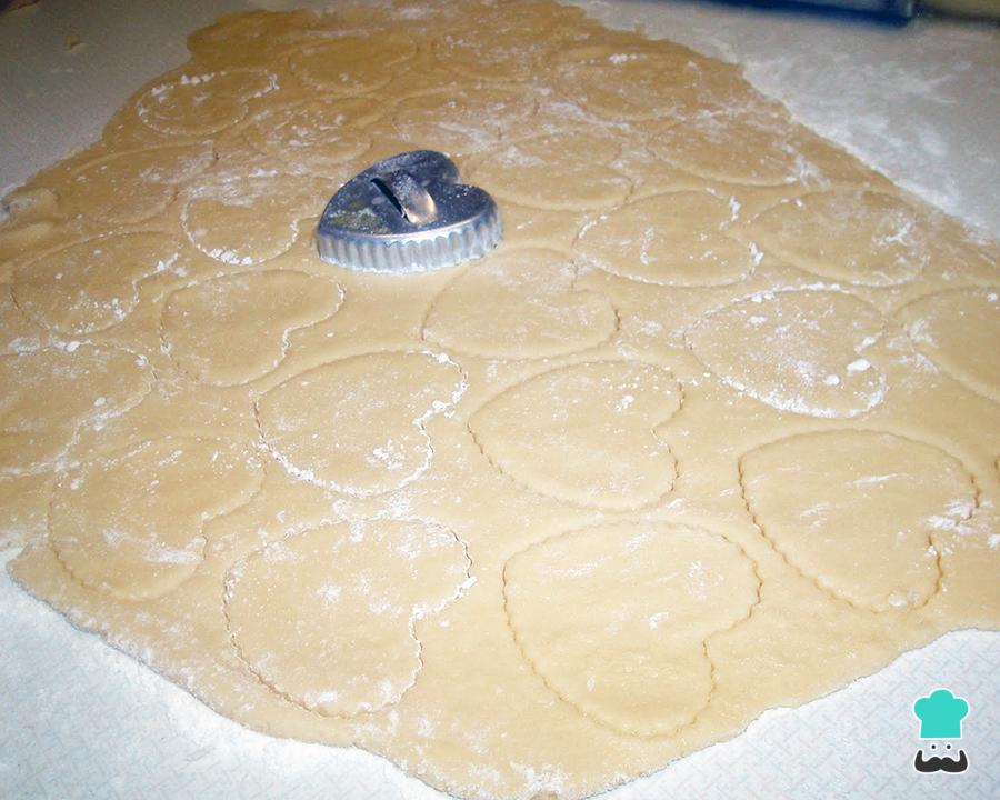 Amasse bem a massa, até que fique compacta e não grudenta. Nesse momento abra com o rolo numa superfície enfarinhada, até que fique com cerca de 1 cm de espessura. Corte usando um cortador de biscoito, um copo ou outro utensílio.