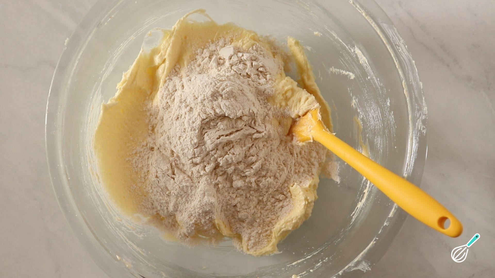 Agora junte os ingredientes secos que peneirámos no início da receita e misture bem e delicadamente, usando uma espátula ou colher.