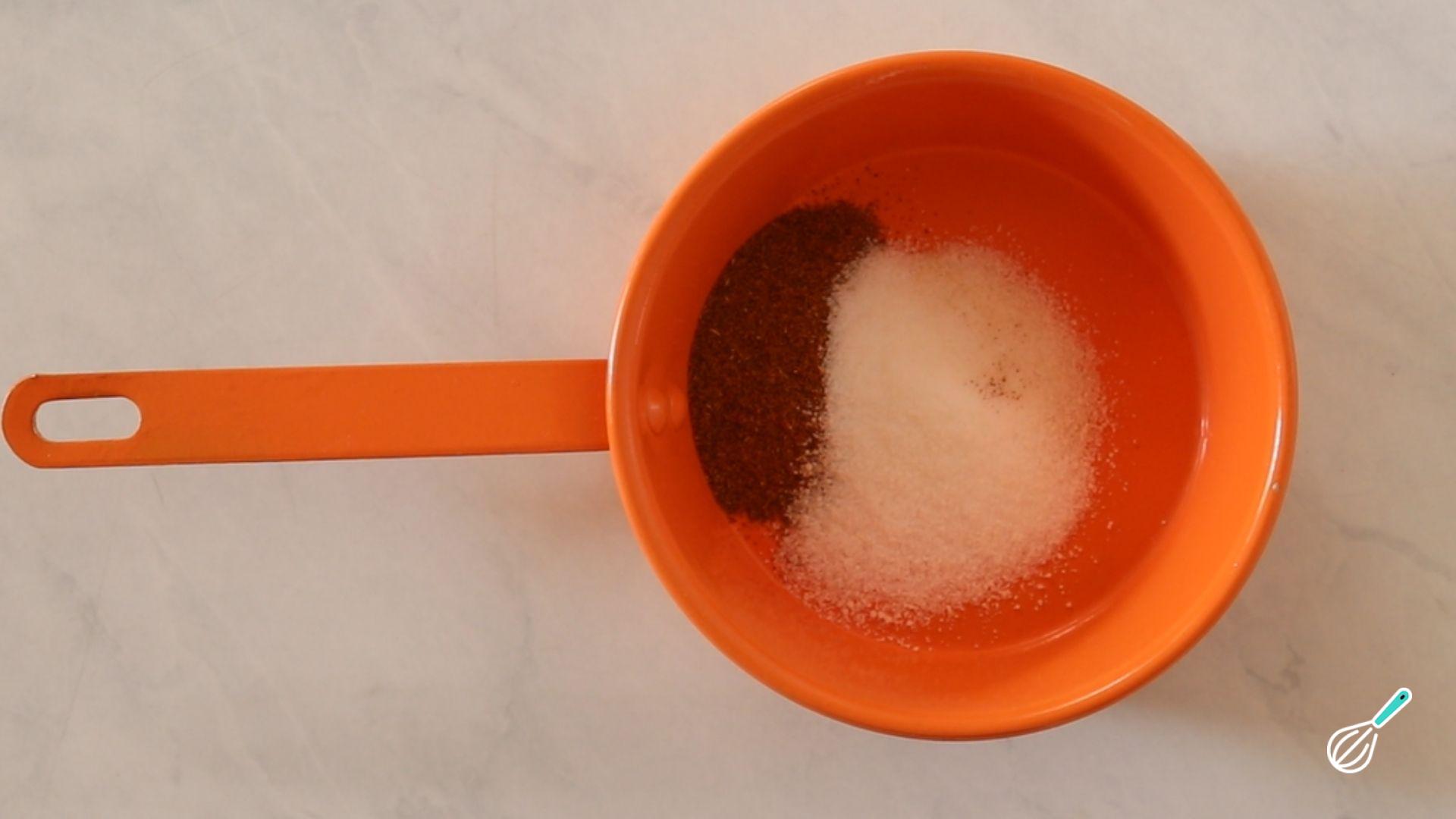 Enquanto isso, misture o açúcar e a canela que vão na cobertura do biscoito snickerdoodle e que lhe conferem um gostinho que lembra rabanada! Pré-aqueça também o forno nos 180ºC.