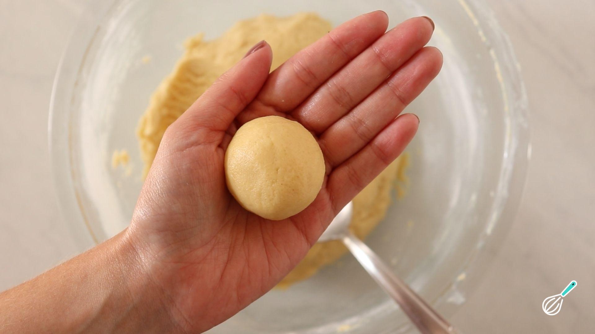 Passado os 30 minutos de geladeira, pegue uma porção da massa no tamanho que desejar e faça uma bolinha.