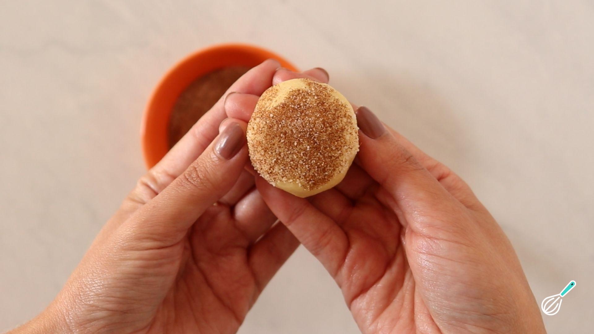 Passe um dos lados das bolinhas no açúcar misturado com canela.