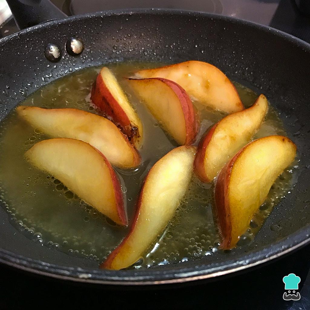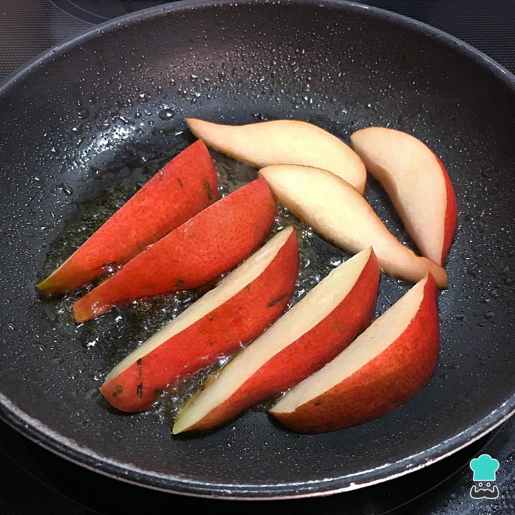 Reserve as costeletas e, na mesma frigideira, doure as peras cortadas em gomos e de ambos os lados também.
