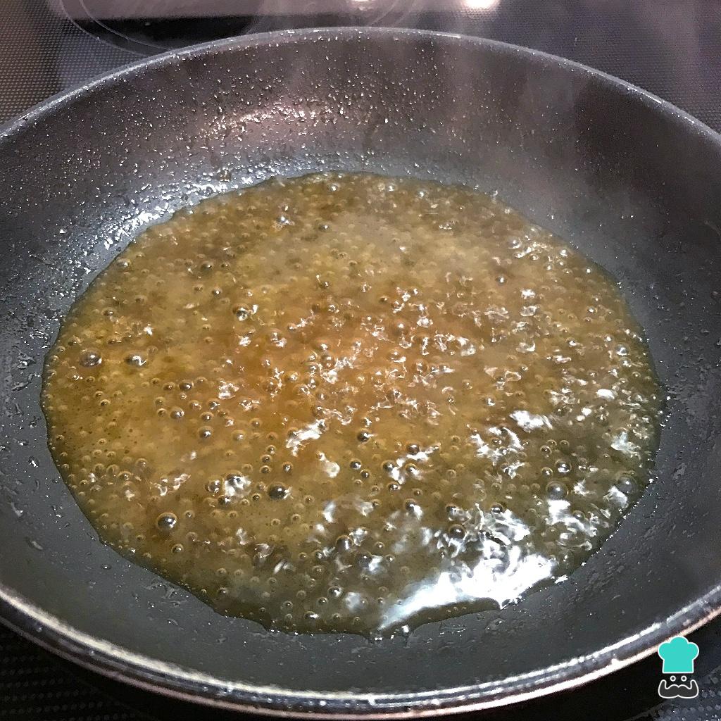Adicione o caldo de frango e o açúcar mascavo. Quando a pera estiver macia, retire do caldo e reserve.
