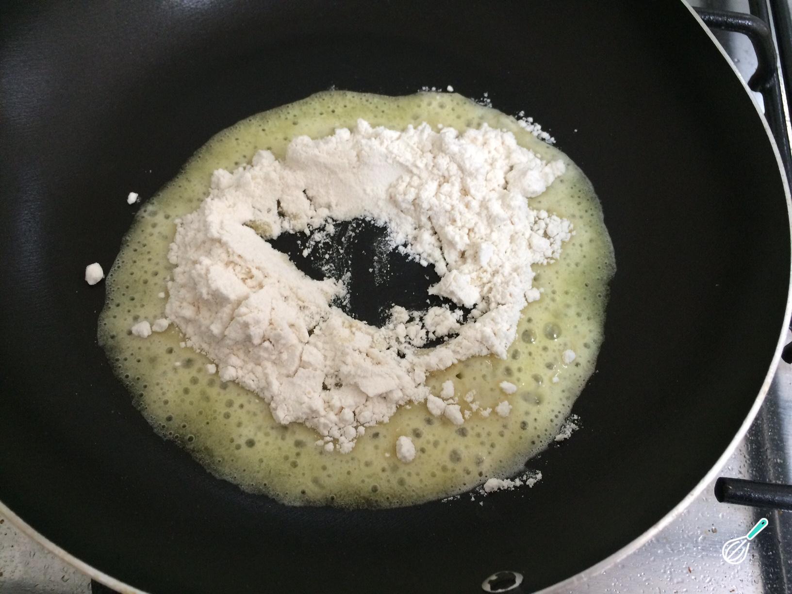 Numa frigideira quente adicione o azeite e a farinha de trigo. Misture muito bem com um batedor manual e deixe cozinhar em fogo médio por alguns minutos, até a farinha ficar dourada.
