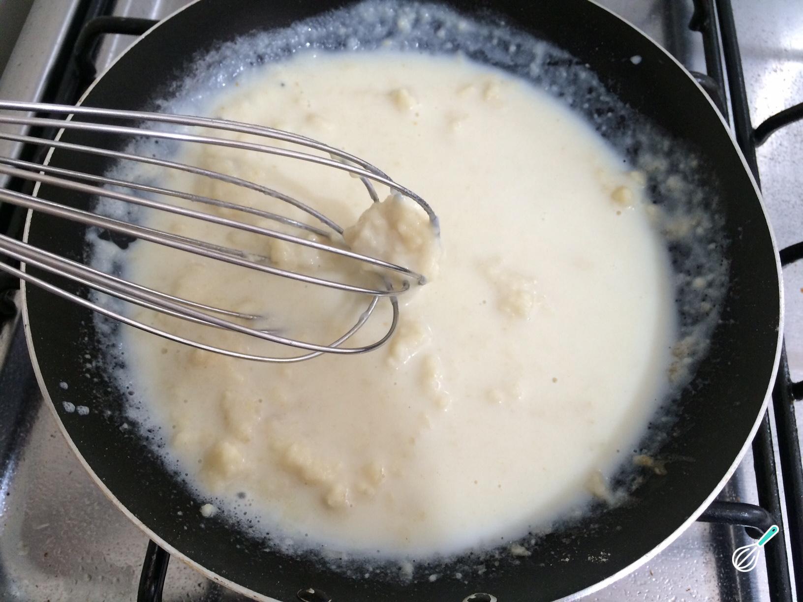 É hora de adicionar lentamente o leite a ferver. Faça isso enquanto mexe com o batedor manual, para dissolver nele a farinha e evitar que se formem grumos.