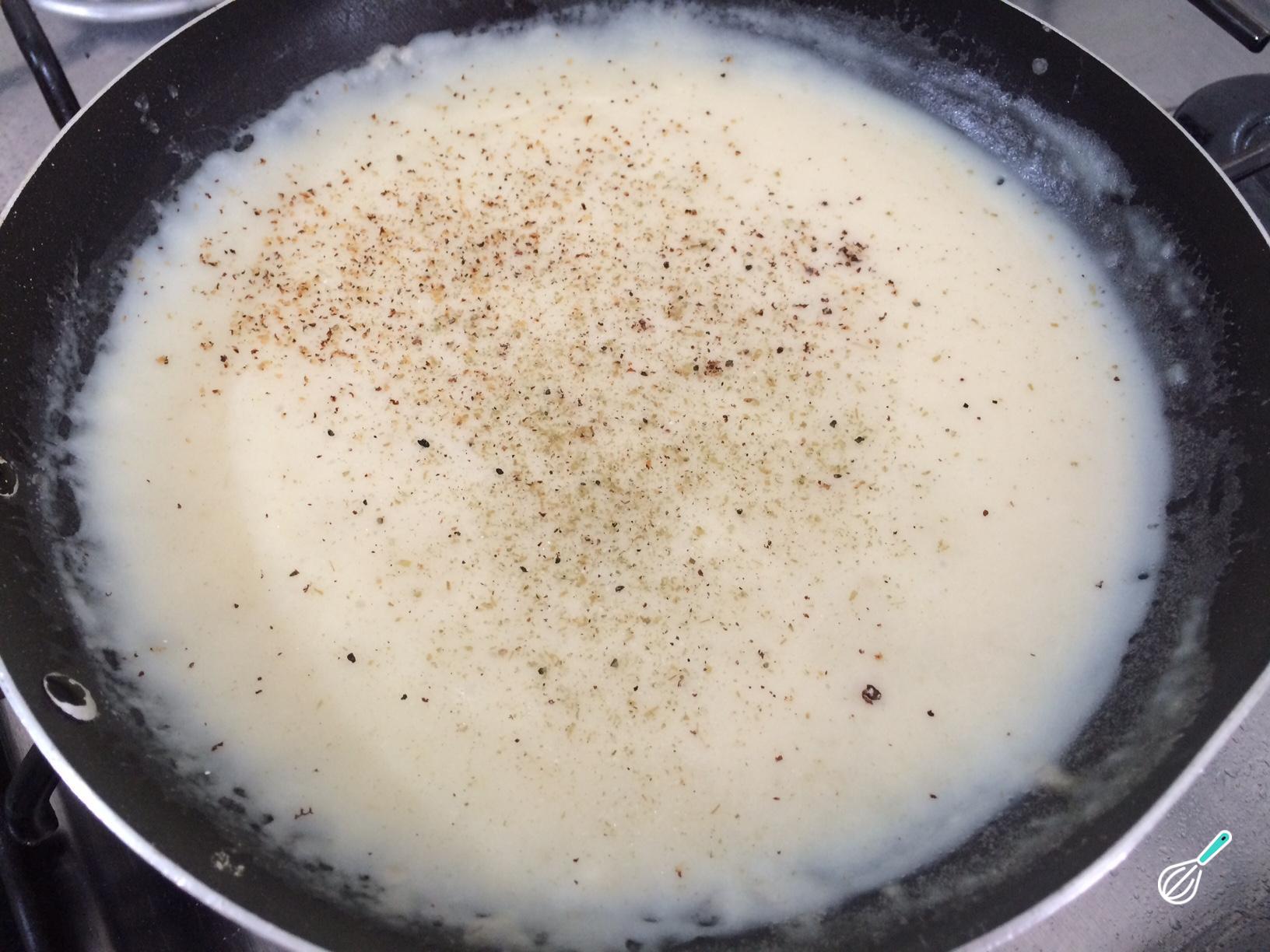 Fique mexendo até conseguir um molho branco suave, espesso e liso. Depois adicione sal, pimenta e uma pitada de noz-moscada, e cozinhar durante mais um minuto.