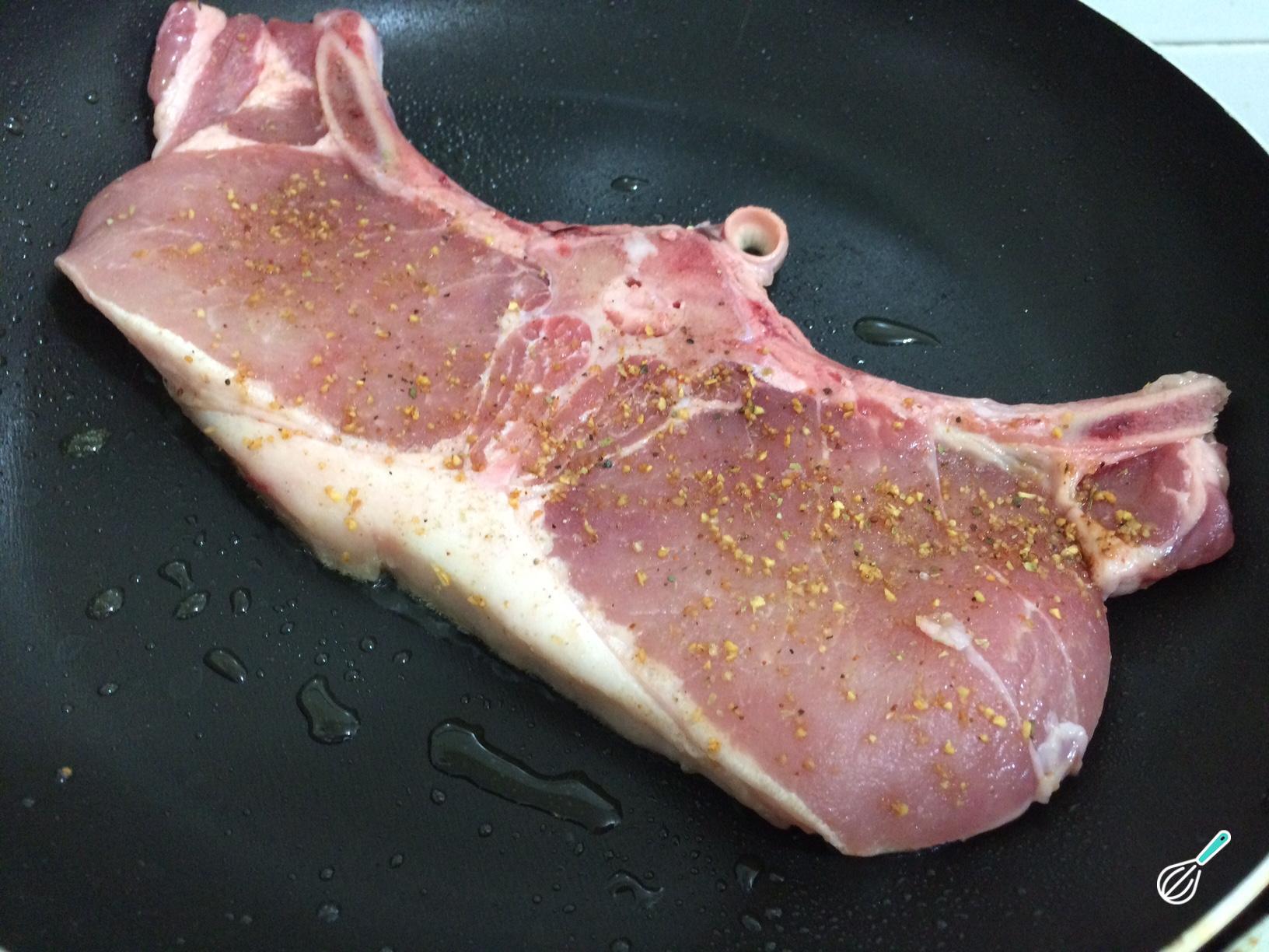 Separadamente, numa frigideira com óleo, cozinhe a bisteca em fogo médio, previamente temperada com sal, pimenta e tempero cajún, por 5 minutos de cada lado.