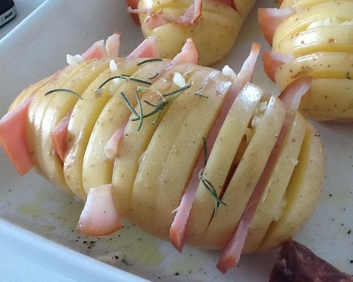 Para fazer bisteca bovina assada no forno comece por descascar e fatiar as batatas (sem separar completamente na base). Coloque um pouco de presunto ou bacon entre cada fatia, como na imagem, e tempere com sal, azeite e ervas aromáticas. Asse por 30 minutos no forno alto (200ºC).