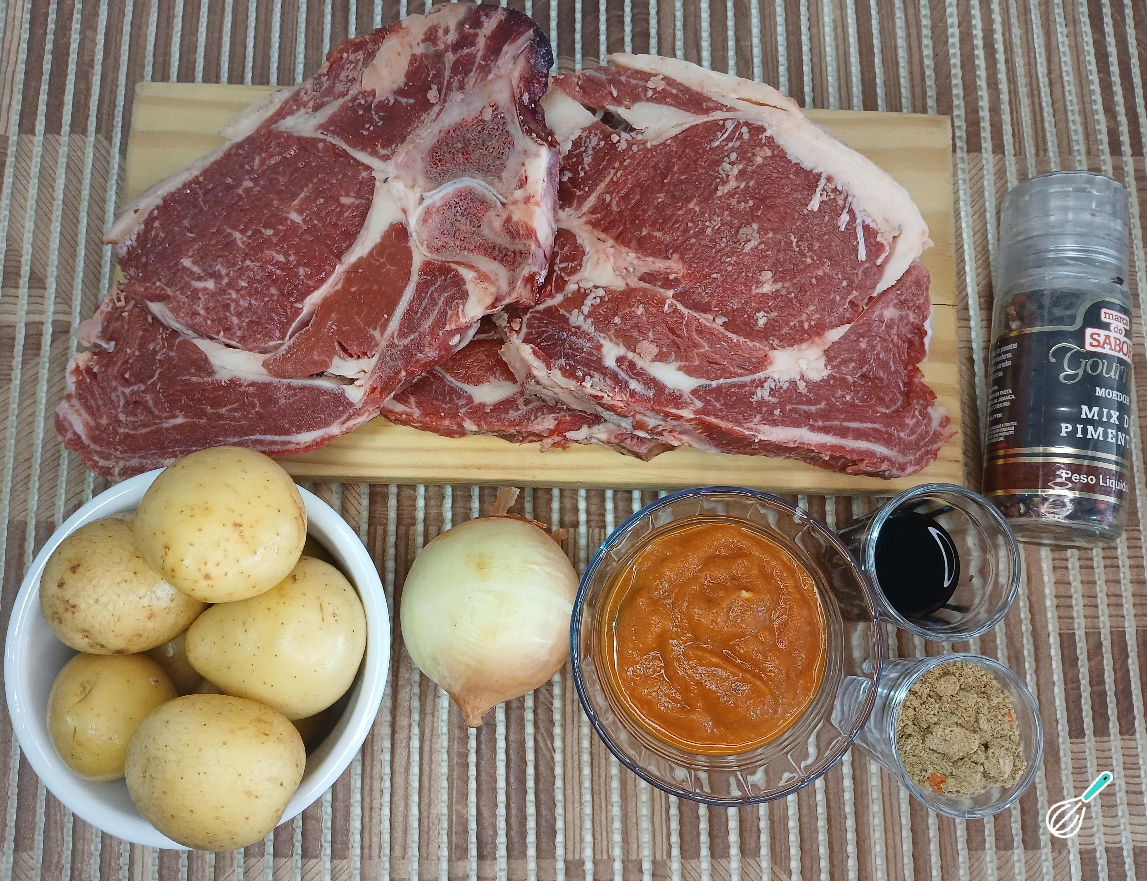 Comece separando os ingredientes para o preparo da bisteca bovina na panela de pressão. Separe os bifes de bisteca bovina, a cebola branca e as batatas bolinha. Separe também os temperos indicados na receita, eles irão garantir o sabor do preparo. Não se esqueça do molho inglês, o extrato de tomate e o açúcar mascavo.