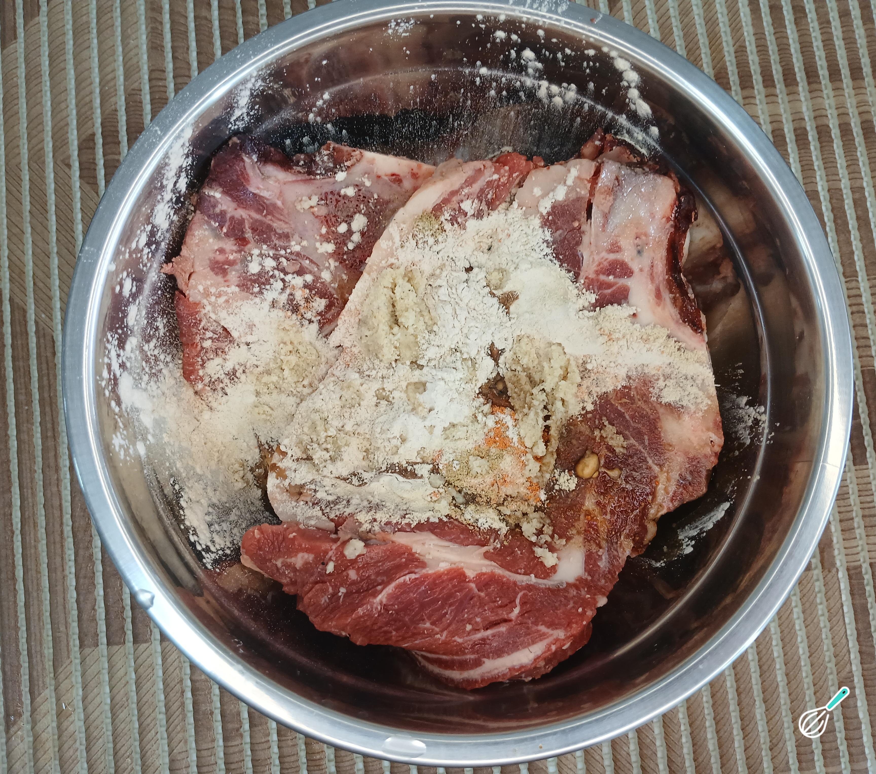 Em um bowl, coloque os bifes de bisteca bovina. Acrescente sal, pimenta, o molho inglês e os temperos indicados. Misture bem os temperos à carne. Passe com as mãos para que absorva bem. Leve o bowl a geladeira e deixe marinar por cerca de 20 minutos. Cubra com papel filme ou papel alumínio.